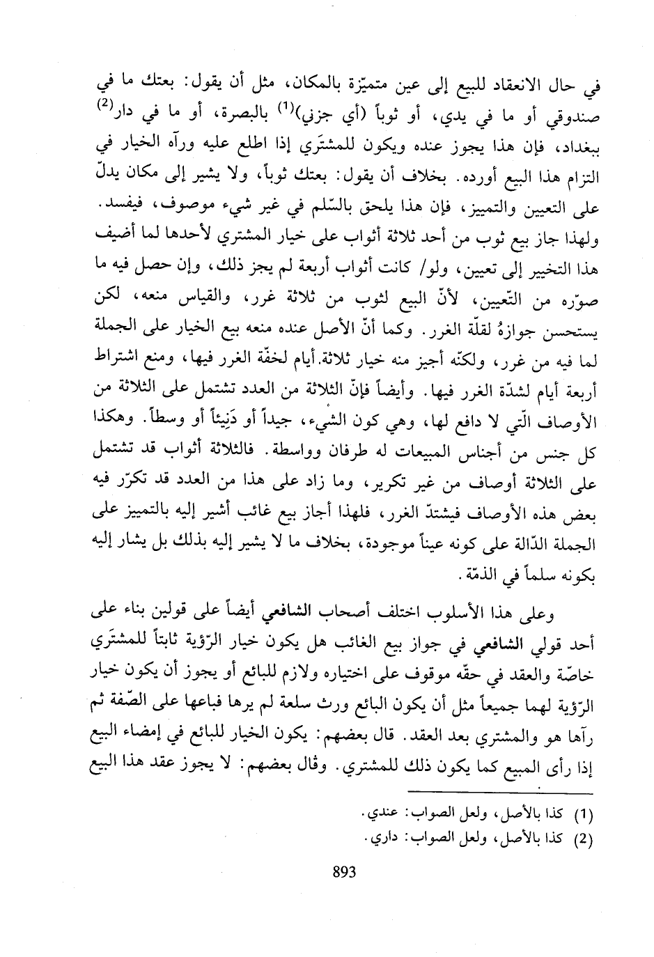 ولهذا جاز بيع ثوب من أحد ثلاثة أثواب على خيار المشتري لأحدها لما أضيف هذا التخيير إلى تعيين، ولو كانت أثواب أربعة لم يجز ذلك، وإن حصل فيه ما صوّره من التّعيين، لأنّ البيع لثوب من ثلاثة غرر، والقياس منعه، لكن يستحسن جوازهُ لقلّة الغرر. وكما أنّ الأصل عنده منعه بيع الخيار على الجملة لما فيه من غرر، ولكنّه أجيز منه خيار ثلاثة. أيام لخفّة الغرر فيها، ومنع اشتراط أربعة أيام لشدّة الغرر فيها. وأيضًا فإنّ الثلاثة من العدد تشتمل على الثلاثة من الأوصاف ائتي لا دافع لها، وهي كون الشْيء، جيدًا أو دَنِيئًا أو وسطًا. وهكذا كل جنس من أجناس المبيعات له طرفان وواسطة. فالثلاثة أثواب قد تشتمل على الثلاثة أوصاف من غير تكرير، وما زاد على هذا من العدد قد تكرّر فيه بعض هذه الأوصاف فيشتدّ الغرر، فلهذا أجاز بيع غائب أشير إليه بالتمييز على الجملة الدّالة على كونه عينًا موجودة، بخلاف ما لا يشير إليه بذلك بل يشار إليه بكونه سلماَّ فَي الذمّة.