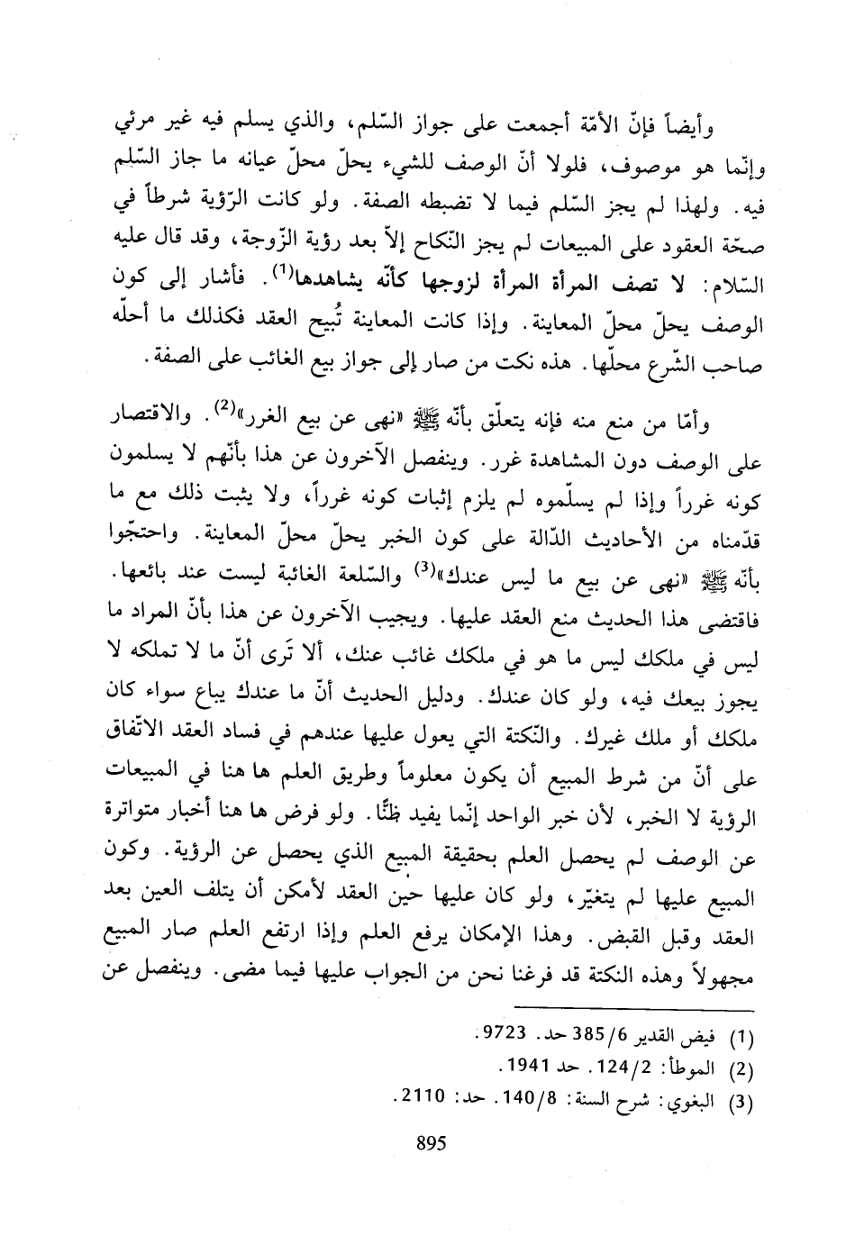 فاقتضى هذا الحديث منع العقد عليها. ويجيب الآخرون عن هذا بأنّ المراد ما ليس في ملكك ليس ما هو في ملكك غائب عنك، ألا تَرى أنّ ما لا تملكه لا يجوز بيعك فيه، ولو كان عندك. ودليل الحديث أنّ ما عندك يياع سواء كان ملكك أو ملك غيرك. والنّكتة التي يعول عليها عندهم في فساد العقد الاتّفاق على أنّ من شرط المبيع أن يكون معلومًا وطريق العلم ها هنا في المبيعات الرؤية لا الخبر، لأن خبر الواحد إنّما يفيد ظنًّا. ولو فرض ها هنا أخبار متواترة عن الوصف لم يحصل العلم بحقيقة المبيع الذي يحصل عن الرؤية. وكون المبيع عليها لم يتغيّر، ولو كان عليها حين العقد لأمكن أن يتلف العين بعد العقد وقبل القبض. وهذا الإمكان يرفع العلم وإذا ارتفع العلم صار المبيع مجهولًا وهذه النكتة قد فرغنا نحن من الجواب عليها فيما مضى. وينفصل عن