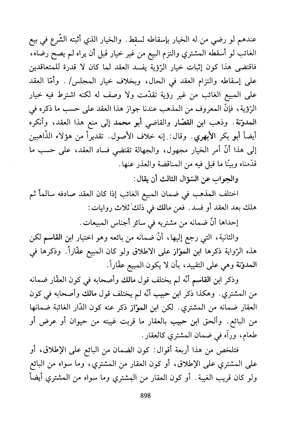 عندهم لو رضي من له الخيار بإسقاطه لسقط. والخيار الذي أثبته الشّرع في بيع الغائب لو أسقطه المشتري والتزم البيع من غير خيار قبل أن يراه لم يصح رضاه، فاقتضى هذا كون إثبات خيار الرّؤية يفسد العقد لما كان لا قدرة للمتعاقدين على إسقاطه والتزام العقد في الحال، وبخلاف خيار المجلس. وأمّا العقد على المبيع الغائب من غير رؤية تقدّمت ولا وصف له لكنه اشترط فيه خيار الرّؤية، فإنّ المعروف من المذهب عندنا جواز هذا العقد على حسب ما ذكره في المدوّنة. وذهب ابن القصّار والقاضي أبو محمَّد إلى منع هذا العقد، وأنكره أيضًا أبو بكر الأبهري. وقال:. إنه خلاف الأصول. تقديرًا من هؤلاء الذّاهبين إلى هذا أنّ أمر الخيار مجهول، والجهالة تقتضي فساد العقد، على حسب ما قدّمناه وبينّا ما قيل فيه من المناقضة والعذر عنها.