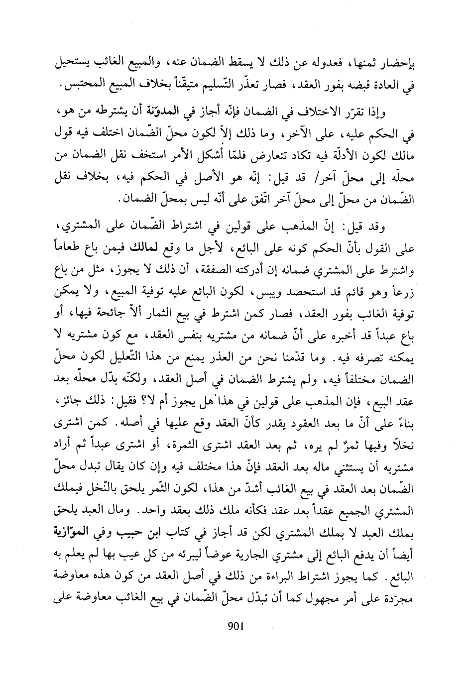 وقد قيل: إنّ المذهب على قولين في اشتراط الضّمان على المشتري، على القول بأنّ الحكم كونه على البائع، لأجل ما وقع لمالك فيمن باع طعامًا واشترط على المشتري ضمانه إن أدركته الصفقة، أن ذلك لا يجوز، مثل من باع زرعًا وهو قائم قد استحصد ويبس، لكون البائع عليه توفية المبيع، ولا يمكن توفية الغائب بفور العقد، فصار كمن اشترط في بيع الثمار ألاّ جائحة فيها، أو باع عبدًا قد أخبره على أنّ ضمانه من مشتريه بنفس العقد، مع كون مشتريه لا يمكنه تصرفه فيه. وما قدّمنا نحن من العذر يمنع من هذا التّعليل لكون محلّ الضمان مختلفًا فيه، ولم يشترط الضمان في أصل العقد، ولكنّه بدّل محلّه بعد عقد البيع، فإن المذهب على قولين في هذا. هل يجوز أم لا؟ فقيل: ذلك جائز، بناءً على أنّ ما بعد العقود يقدر كأنّ العقد وقع عليها في أصله. كمن اشترى نخلًا وفيها ثمرٌ لم يره، ثم بعد العقد اشترى الثمرة، أو اشترى عبدًا ثم أراد مشتريه أن يستثني ماله بعد العقد فإنّ هذا مختلف فيه وإن كان يقال تبدل محلّ الضّمان بعد العقد في بيع الغائب أشدّ من هذا، لكون الثّمر يلحق بالتخل فيملك المشتري الجميع عقدًا بعد عقد فكأنه ملك ذلك بعقد واحد. ومال العبد يلحق بملك العبد لا بملك المشتري لكن قد أجاز في كتاب ابن حبيب وفي الموّازية أيضًا أن يدفع البائع إلى مشتري الجارية عوضًا ليبرئه من كل عيب بها لم يعلم به البائع. كما يجوز اشتراط البراءة من ذلك في أصل العقد من كون هذه معاوضة مجرّدة على أمر مجهول كما أن تبدّل محلّ الضّمان في بيع الغائب معاوضة على