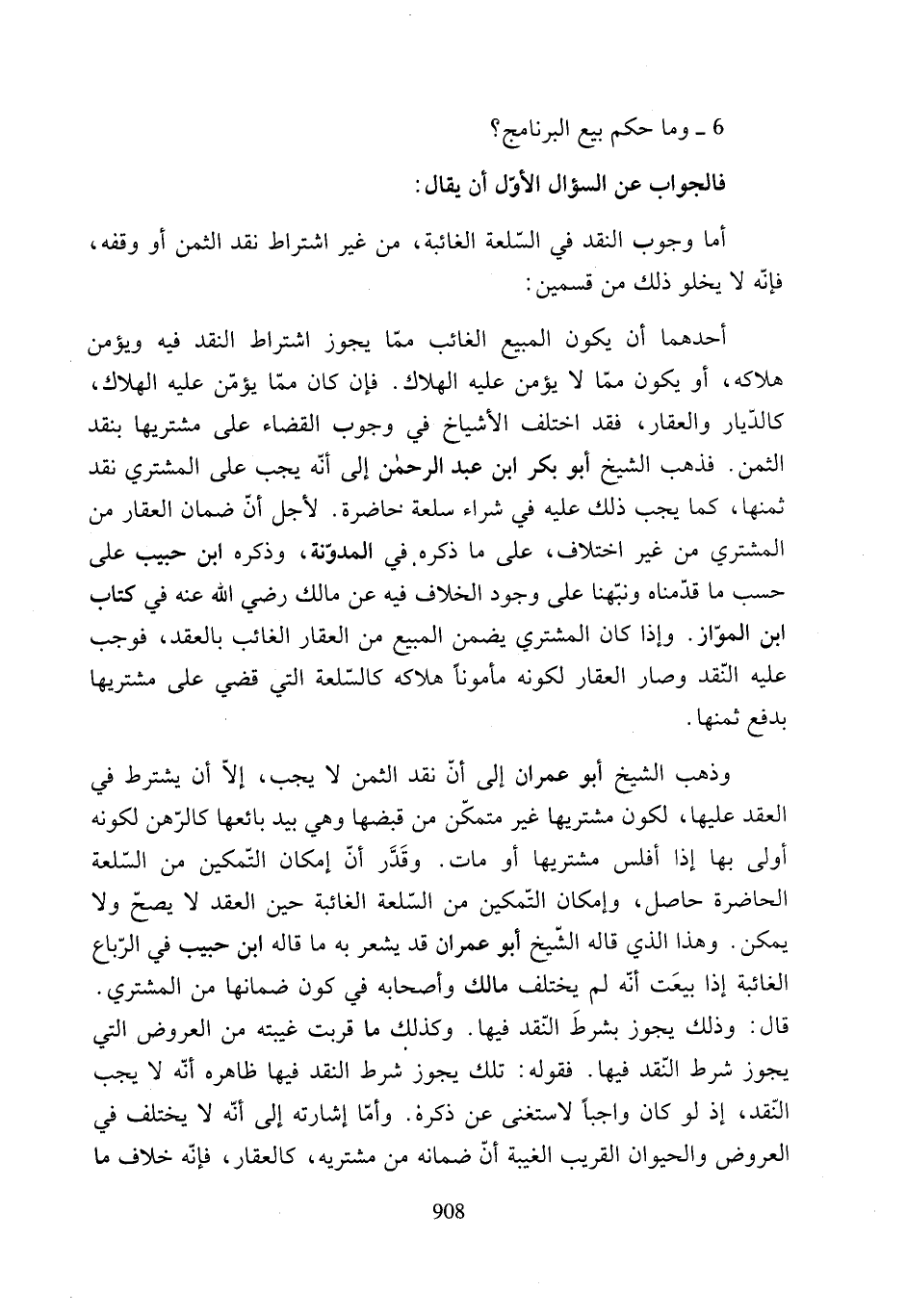 وذهب الشيخ أبو عمران إلى أنّ نقد الثمن لا يجب، إلاّ أن يشترط في العقد عليها، لكون مشتريها غير متمكّن من قبضها وهي بيد بائعها كالرّهن لكونه أولى بها إذا أفلس مشتريها أو مات. وقَدَّر أنّ إمكان التّمكين من السّلعة الحاضرة حاصل، وإمكان التّمكين من السّلعة الغائبة حين العقد لا يصحّ ولا يمكن. وهذا الذي قاله الشّيخ أبو عمران قد يشعر به ما قاله ابن حبيب في الرّباع الغائبة إذا بيعَت أنّه لم يختلف مالك وأصحابه في كون ضمانها من المشتري. قال: وذلك يجوز بشرطَ النّقد فيها. وكذللث ما قربت غيبته من العروض التي يجوز شرط النّقد فيها. فقدله: تلك يجوز شرط النقد فيها ظاهره أنّه لا يجب النّقد، إذ لو كان واجبًا لاستغنى عن ذكرة. وأمّا إشارته إلى أنّه لا يختلف في العروض والحيوان القريب الغيبة أنّ ضمانه من مشتريه، كالعقار، فإنّه خلاف ما