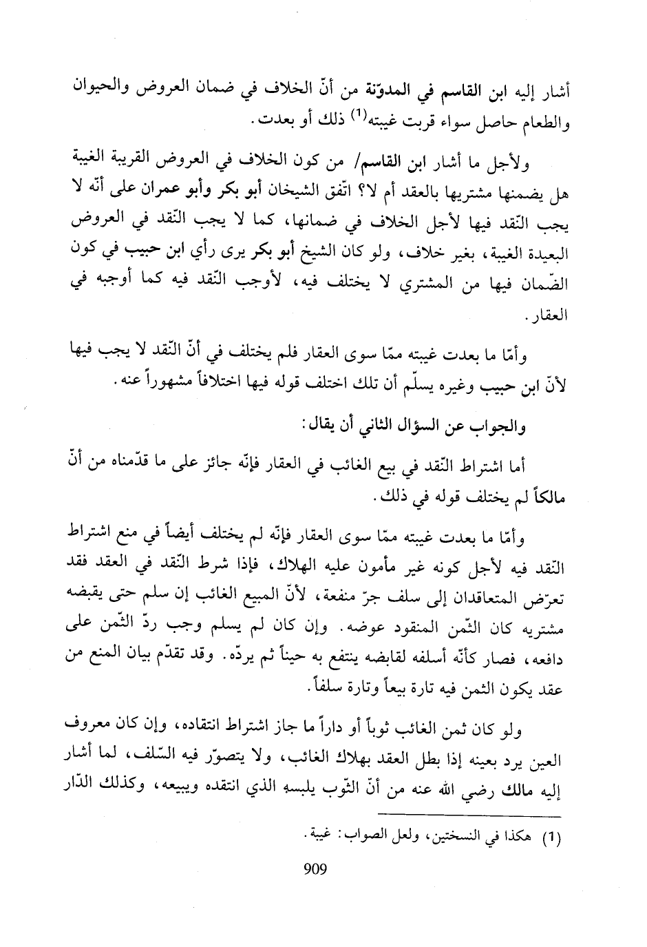 وأمّا ما بعدت غيبته مِمّا سوى العقار فلم يختلف في أنّ النّقد لا يجب فيها لأن ابن حبيب وغيره يسلّم أن تلك اختلف قوله فيها اختلافًا مشهورًا عنه.