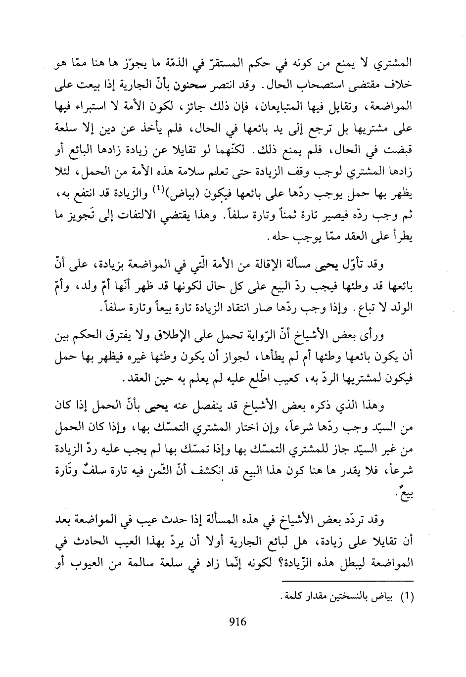 وقد تأوّل يحيى مسألة الإقالة من الأمة التي في المواضعة بزيادة، على أنّ بائعها قد وطئها فيجب ردّ البيع على كل حال لكونها قد ظهر أنّها أمّ ولد، وأمّ الولد لا تباع. وإذا وجب ردّها صار انتقاد الزيادة تارة بيعًا وتارة سلفًا.