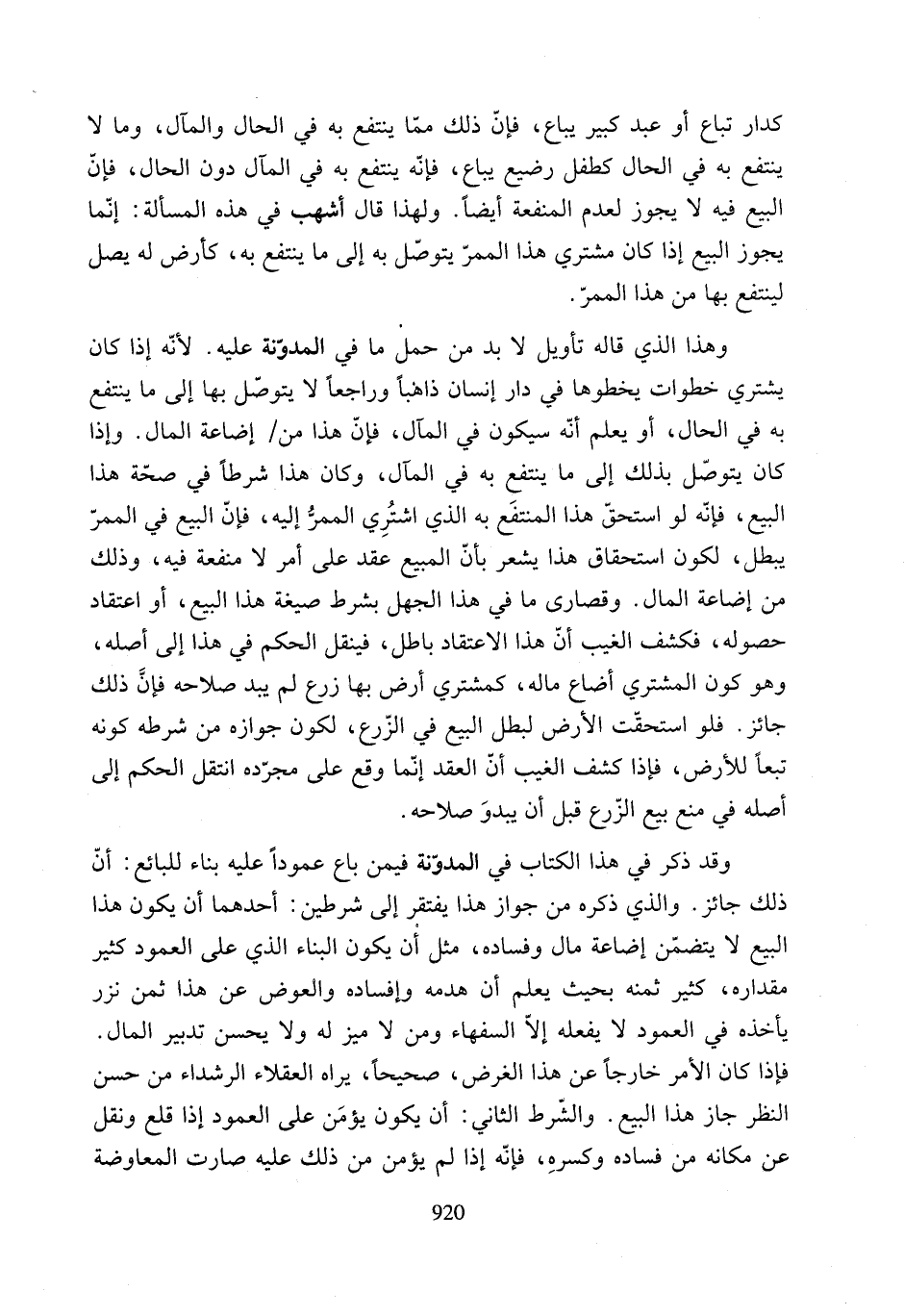 وقد ذكر في هذا الكتاب في المدوّنة فيمن باع عمودًا عليه بناء للبائع: أنّ ذلك جائز. والذي ذكره من جواز هذا يفتقر إلى شرطين: أحدهما أن يكون هذا البيع لا يتضمّن إضاعة مال وفساده، مثل أن يكون البناء الذي على العمود كثير مقداره، كثير ثمنه بحيث يعلم أن هدمه وإفساده والعوض عن هذا ثمن نزر يأخذه في العمود لا يفعله إلاّ السفهاء ومن لا ميز له ولا يحسن تدبير المال.