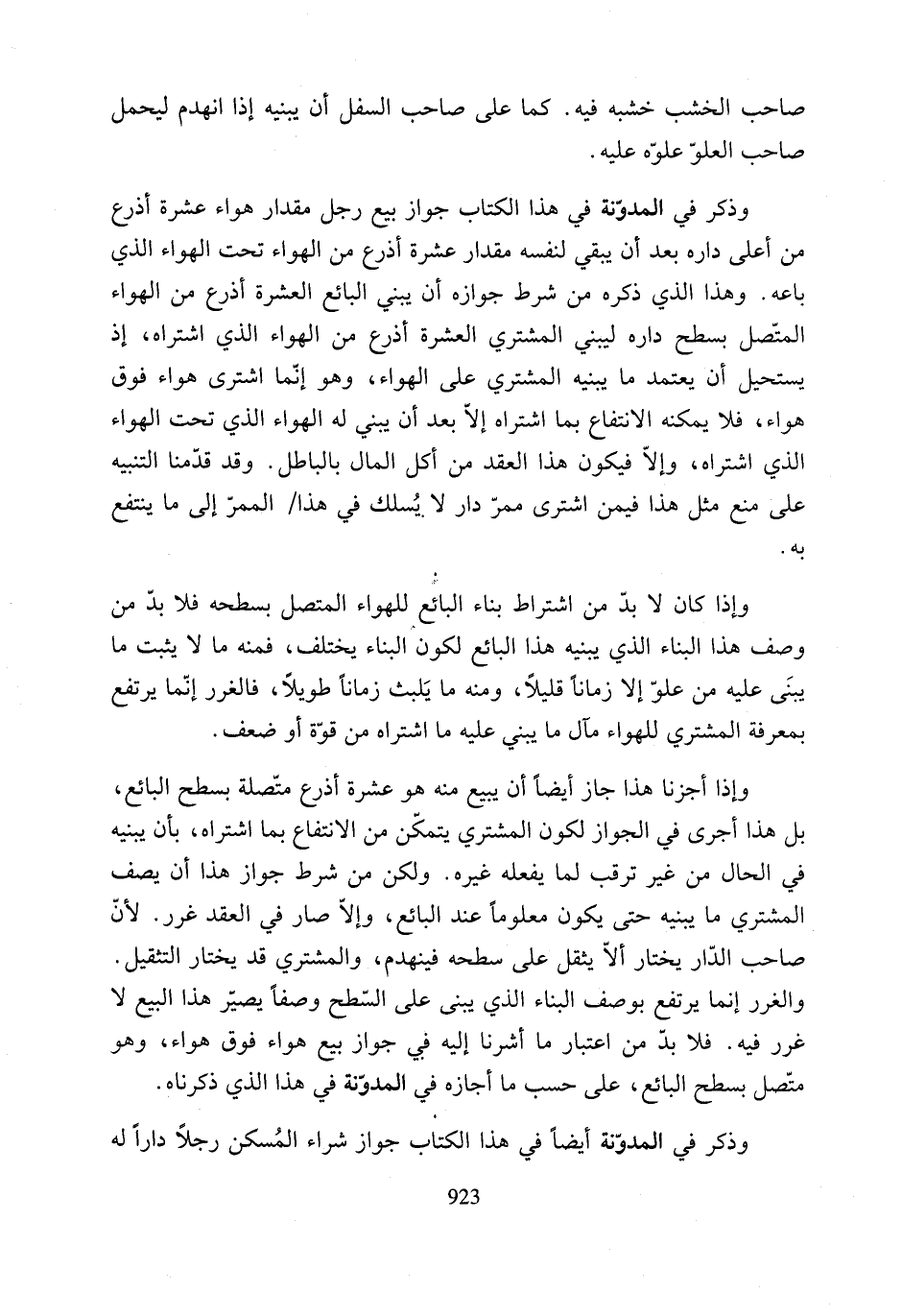 وذكر في المدوّنة في هذا الكتاب جواز بيع رجل مقدار هواء عشرة أذرع من أعلى داره بعد أن يبقي لنفسه مقدار عشرة أذرع من الهواء تحت الهواء الذي باعه. وهذا الذي ذكره من شرط جوازه أن يبني البائع العشرة أذرع من الهواء المتّصل بسطح داره ليبني المشتري العشرة أذرع من الهواء الذي اشتراه، إذ يستحيل أن يعتمد ما يبنيه المشتري على الهواء، وهو إنّما اشترى هواء فوق هواء، فلا يمكنه الانتفاع بما اشتراه إلاّ بعد أن يبني له الهواء الذي تحت الهواء الذي اشتراه، وإلاّ فيكون هذا العقد من أكل المال بالباطل. وقد قدّمنا التنبيه على منع مثل هذا فيمن اشترى ممرّ دار لا يُسلك في هذا الممرّ إلى ما ينتفع وإذا كان لا بدّ من اشتراط بناء البائع للهواء المتصل بسطحه فلا بدّ من وصف هذا البناء الذي يبنيه هذا البائع لكون البناء يختلف، فمنه ما لا يثبت ما يبنَى عليه من علوّ إلا زمانًا قليلًا، ومنه ما يَلبث زمانًا طويلًا، فالغرر إنّما يرتفع بمعرفة المشتري للهواء مآل ما يبني عليه ما اشتراه من قوّة أو ضعف.