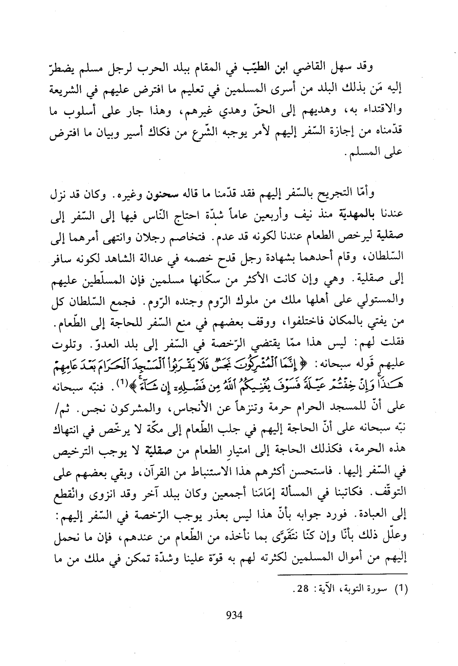 فقلت لهم: ليس هذا ممّا يقتضي الرّخصة في السّفر إلى بلد العدوّ. وتلوت عليهبِم قَوله سبحانه: {إِنَّمَا الْمُشْرِكُونَ نَجَسٌ فَلَا يَقْرَبُوا الْمَسْجِدَ الْحَرَامَ بَعْدَ عَامِهِمْ هَذَا وَإِنْ خِفْتُمْ عَيْلَةً فَسَوْفَ يُغْنِيكُمُ الله مِنْ فَضْلِهِ إِنْ شَاءَ} (¬1). فنبّه سبحانه على أنّ للمسجد الحرام حرمة وتنزهًا عن الأنجاس، والمشركون نجس. ثم نبّه سبحانه على أنّ الحاجة إليهم في جلب الطّعام إلى مكّة لا يرخّص في انتهاك هذه الحرمة، فكذلك الحاجة إلى امتيارِ الطعام من صقليّة لا يوجب الترخيص في السّفر إليها. فاستحسن أكثرهم هذا الاستنباط من القرآن، وبقي بعضهم على التوقّف. فكاتبنا في المسألة إمَامَنا أجمعين وكان ببلد آخر وقد انزوى وانْقطع إلى العبادة. فورد جوابه بأنّ هذا ليس بعذر يوجب الرّخصة في السّفر إليهم: وعلّل ذلك بأنّا وإن كنّا نتَقَوَّى بما نأخذه من الطّعام من عندهم، فإن ما نحمل إليهم من أموال المسلمين لكثرته لهم به قوّة علينا وشدّة تمكن في ملك من ما