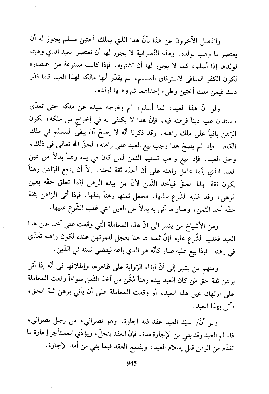 ولو أنّ هذا العبد، لما أسلم، لم يخرجه سيده عن ملكه حتى تعدّى فاستدان عليه دينًا فرهنه فيه، فإن هذا لا يكتفى به في إخراج من ملكه، لكون الرّهن باقيًا على ملك راهنه. وقد ذكرنا أنَّه لا يصحّ أن يبقى المسلم في ملك الكافر. فإذا لم يصحّ هذا وجب بيع العبد على راهنه، لحقّ الله تعالى في ذلك،