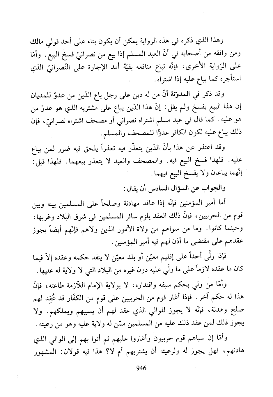 أما أمير المؤمنين فإنّه إذا عاقد مهادنة وصلحًا على المسلمين بينه وبين قوم من الحربيين، فإنّ ذلك العقد يلزم سائر المسلمين في شرق البلاد وغربها، وحيثما كانوا. وما من سواهم من ولاة الأفور الذين ولاهم فإنّهم أيضًا يجوز عقدهم على مقتضى ما أذن لهم فيه أمير المؤمنين.