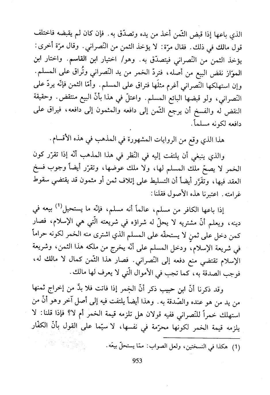 إذا باعها الكافر من مسلم، عالمًا أنه مسلم، فإنّه ما يستحيل (¬1) بيعه في دينه، ويعلم أنّ مشتريه لا يحلّ له شراؤه في شريعته الّتي هي الإِسلام، فصار كمن دخل على ثمنٍ لا يستحقّه على المسلم الذي اشترى منه الخمر لكونه حرامًا في شريعة الإِسلام، ودخل المسلم على أنّه يخرج من ملكه هذا الثمن، وشريعة الإِسلام تقتضي منع دفعه إلى النّصراني. فصار هذا الثمن كمال لا مالك له، فوجب الصدقة به، كما تجب في الأموال الّتي لا يعرف لها مالك.
