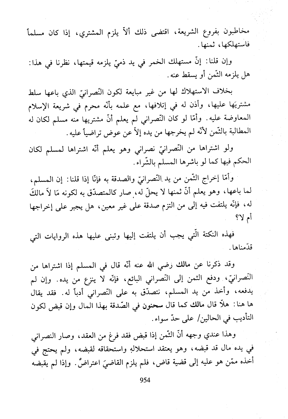 وهذا عندي وجهه أنّ الثّمن إذا قبض فقد فرغ من العقد، وصار النصراني في يده مال قد قبضه، وهو يعتقد استحلاله واستحقاقه لقبضه، ولم يحتج في أخذه مِمّن هو عليه إلى قضية قاض، فلم يلزم القاضيَ اعتراضٌ. وإذا لم يقبضه