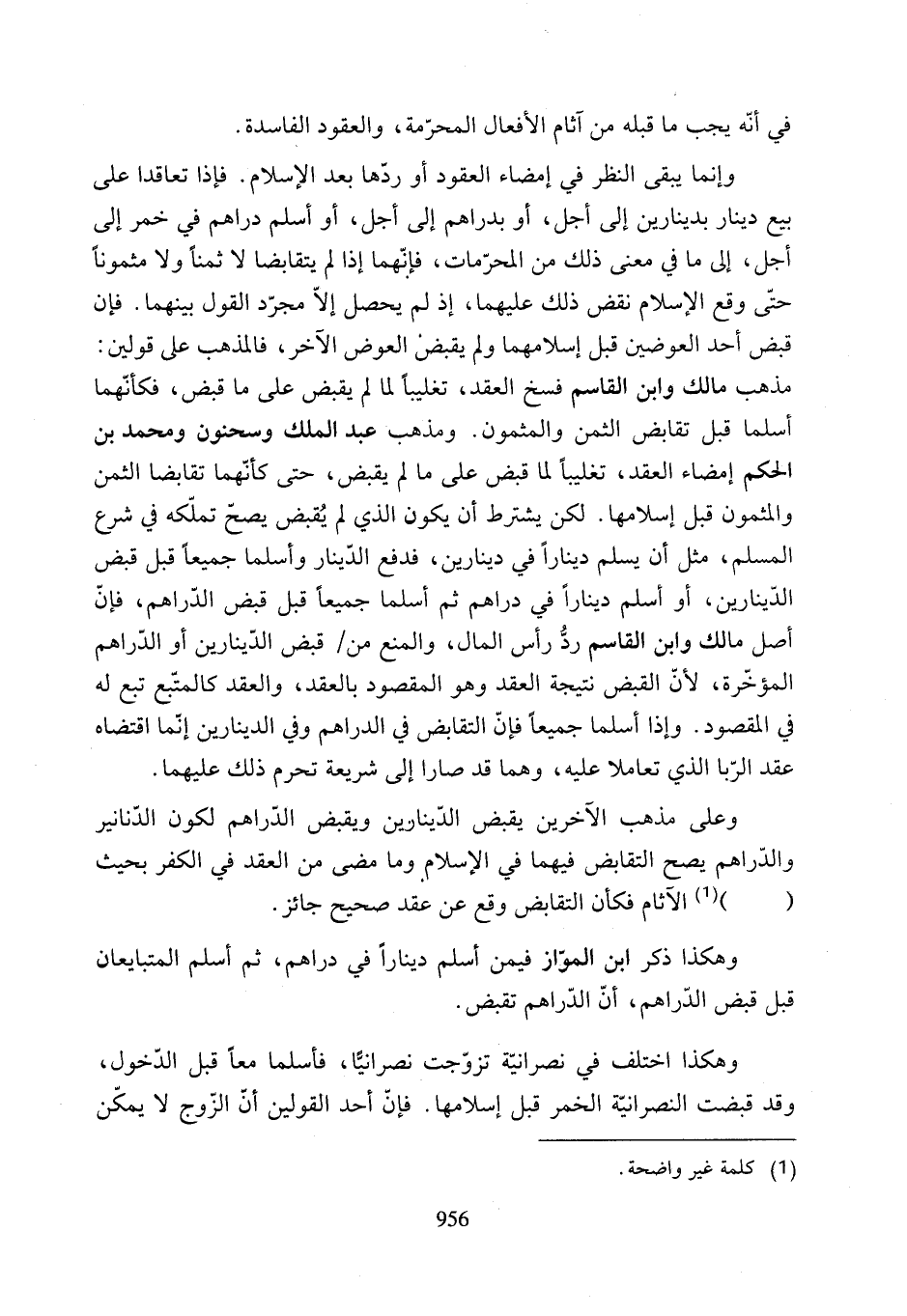 وإنما يبقى النظر في إمضاء العقود أو ردّها بعد الإِسلام. فإذا تعاقدا على بيع دينار بدينارين إلى أجل، أو بدراهم إلى أجل، أو أسلم دراهم في خمر إلى أجل، إلى ما في معنى ذلك من المحرّمات، فإنّهما إذا لم يتقابضا لا ثمنًا ولا مثمونًا حتّى وقع الإِسلام نقض ذلك عليهما، إذ لم يحصل إلاّ مجرّد القول بينهما. فإن قبض أحد العوضن قبل إسلامهما ولم يقبفن العوض الآخر، فالمذهب على قولين: مذهب مالك وابن القاسم فسخ العقد، تغليبًا لما لم يقبض على ما قبض، فكأنّهما أسلما قبل تقابض الثمن والمثمون. ومذهب عبد الملك وسحنون ومحمد بن الحكم إمضاء العقد، تغليبًا لما قبض على ما لم يقبض، حتى كأنّهما تقابضا الثمن والمثمون قبل إسلامها. لكن يشترط أن يكون الذي لم يُقبض يصحّ تملّكه في شرع المسلم، مثل أن يسلم دينارًا في دينارين، فدفع الدّينار وأسلما جميعًا قبل قبض الدينارين، أو أسلم دينارًا في دراهم ثم أسلما جميعًا قبل قبض الدّراهم، فإنّ أصل مالك وابن القاسم ردُّ رأس المال، والمنع من قبض الدّينارين أو الدّراهم المؤخّرة، لأن القبض نتيجة العقد وهو المقصود بالعقد، والعقد كالمتبع تبع له في المقصود. وإذا أسلما جميعًا فإنّ التقابض في الدراهم وفي الدينارين إنّما إقتضاه عقد الرِّبا الذي تعاملا عليه، وهما قد صارا إلى شريعة تحرم ذلك عليهما.