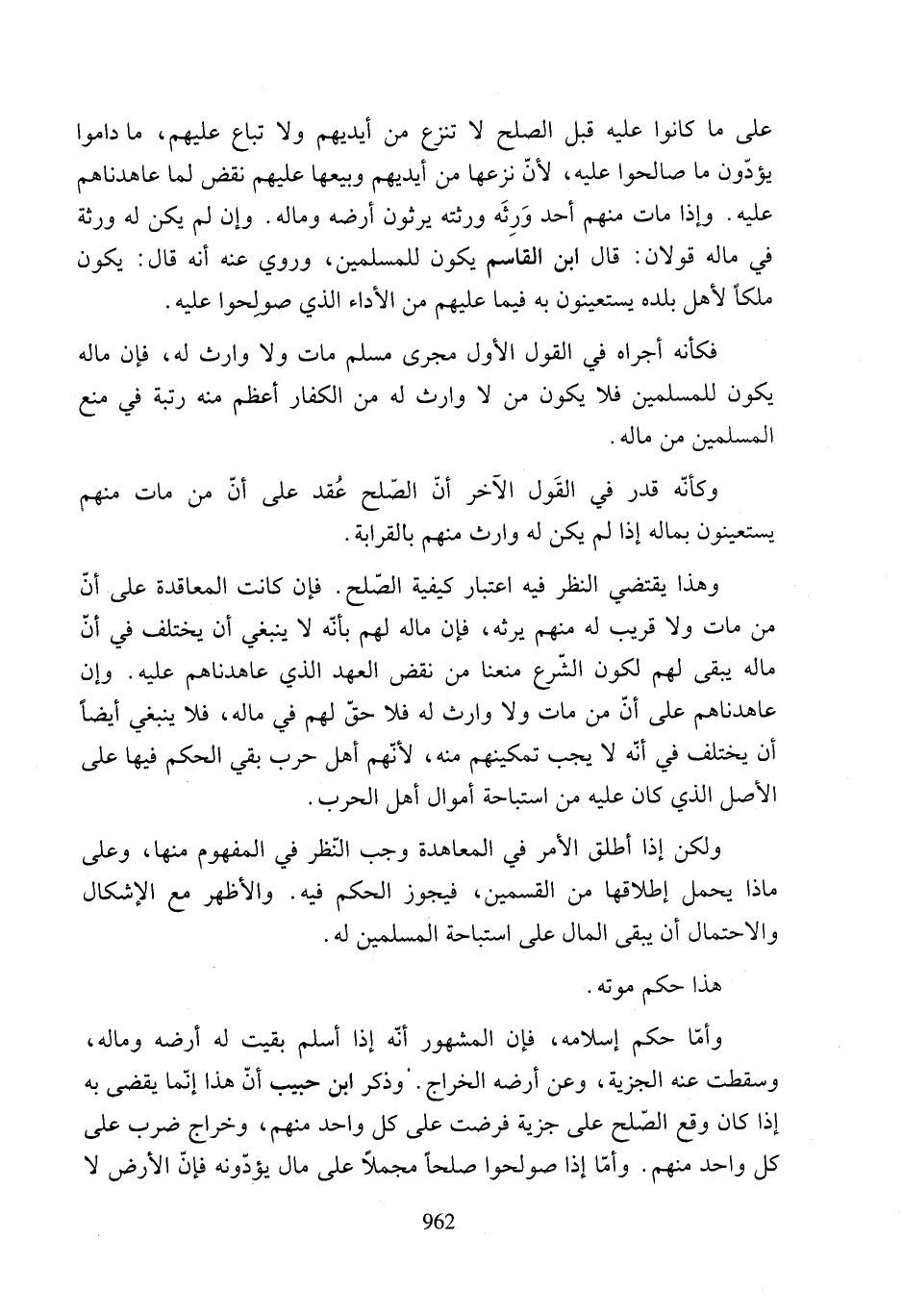 وهذا يقتضي النظر فيه اعتبار كيفية الصّلح. فإن كانت المعاقدة على أن من مات ولا قريب له منهم يرثه، فإن ماله لهم بأنه لا ينبغي أن يختلف في أنّ ماله يبقى لهم لكون الشّرع منعنا من نقض العهد الذي عاهدناهم عليه. وإن عاهدناهم على أن من مات ولا وارث له فلا حقّ لهم في ماله، فلا ينبغي أيضًا أن يختلف في أنّه لا يجب تمكينهم منه، لأنهم أهل حرب بقي الحكم فيها على الأصل الذي كان عليه من استباحة أموال أهل الحرب.