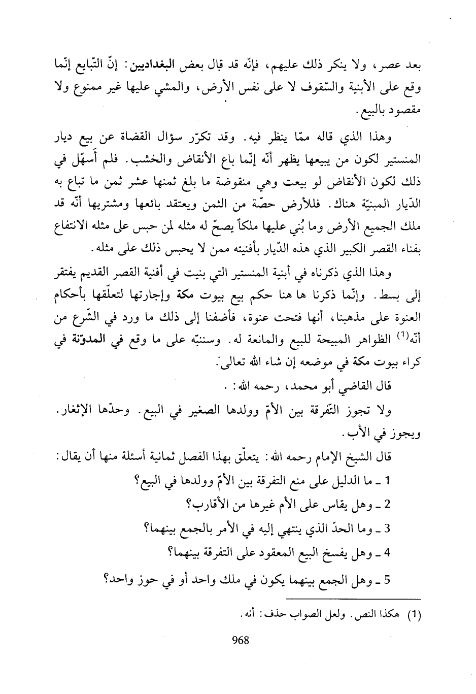 وهذا الذي قاله ممّا ينظر فيه. وقد تكرّر سؤال القضاة عن بيع ديار المنستير لكون من يبيعها يظهر أنّه إنّما باع الأنقاض والخشب. فلم أَسهّل في ذلك لكون الأنقاض لو بيعت وهي منقوضة ما بلغ ثمنها عشر ثمن ما تباع به الدّيار المبنيّة هناك. فللأرض حصّة من الثمن ويعتقد بائعها ومشتريها أنّه قد ملك الجميع الأرض وما بُني عليها ملكًا يصحّ له مثله لمن حبس على مثله الانتفاع بفناء القصر الكبير الذي هذه الديار بأفنيته ممن لا يحبس ذلك على مثله.
