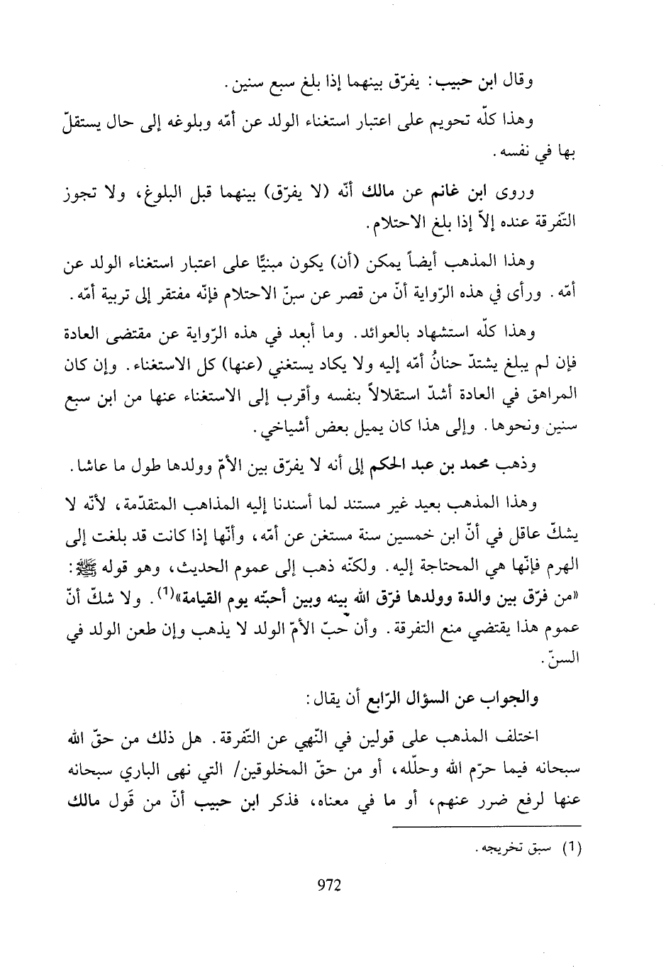 وهذا كلّه استشهاد بالعوائد. وما أببد في هذه الرواية عن مقتضى العادة فإن لم يبلغ يشتدّ حنانُ أنه إليه ولا يكاد يستغني (عنها) كل الاستغناء. وإن كان المراهق في العادة أشدّ استقلالًا بنفسه وأقرب إلى الاستغناء عنها من ابن سبع سنين ونحوها. وإلى هذا كان يميل بعض أشياخي.