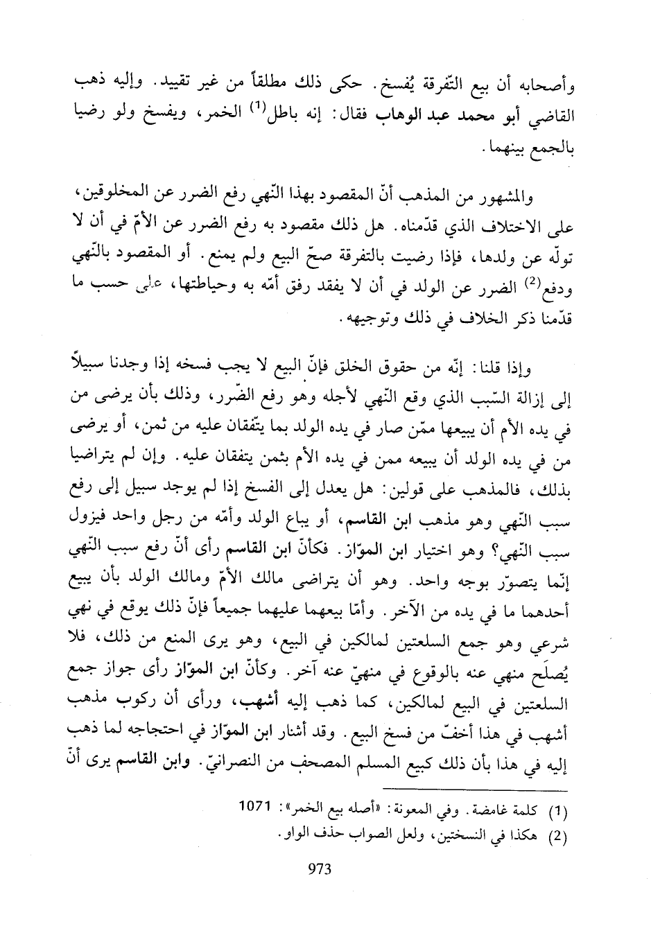 والمشهور من المذهب أن المقصود بهذا النهي رفع الضرر عن المخلوقين، على الاختلاف الذي قدّمناه. هل ذلك مقصود به رفع الضرر عن الأمّ في أن لا تولّه عن ولدها، فإذا رضيت بالتفرقة صحّ البيع ولم يمنع. أو المقصود بالنّهي ودفع (¬2) الضرر عن الولد في أن لا يفقد رفق أمّه به وحياطتها، على حسب ما قدّمنا ذكر الخلاف في ذلك وتوجيهه.