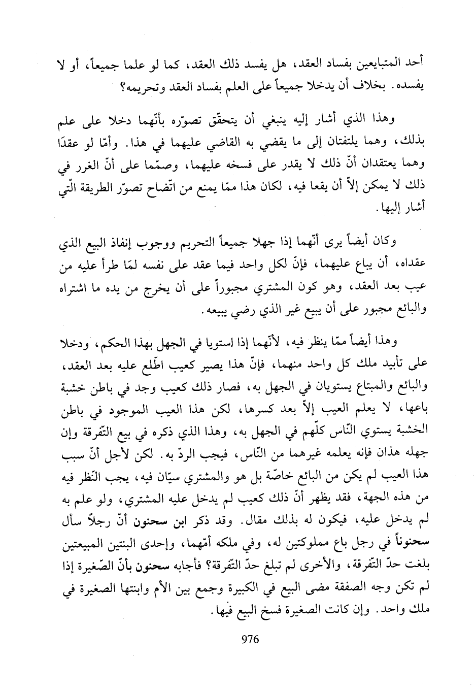 وهذا أيضًا مَمّا ينظر فيه، لأنّهما إذا استويا في الجهل بهذا الحكم، ودخلا على تأبيد ملك كل واحد منهما، فإنّ هذا يصير كعيب اطّلع عليه بعد العقد، والبائع والمبتاع يستويان في الجهل به، فصار ذلك كعيب وجد في باطن خشبة باعها، يعلم العيب إلاّ بعد كسرها، لكن هذا العيب الموجود في باطن الخشبة يستوي النّاس كلّهم في الجهل به، وهذا الذي ذكره في بيع التّفرقة وإن جهله هذان فإنه يعلمه غيرهما من النَّاس، فيجب الردّ به. لكن لأجل أن سبب هذا العيب لم يكن من البائع خاصّة بل هو والمشتري سيان فيه، يجب النّظر فيه من هذه الجهة، فقد يظهر أنّ ذلك كعيب لم يدخل عليه المشتري، ولو علم به لم يدخل عليه، فيكون له بذلك مقال. وقد ذكر ابن سحنون أنّ رجلًا سأل سحنونًا في رجل باع مملوكتين له، وفي ملكه أمّهما، وإحدى البنتين المبيعتين بلغت حدّ التّفرقة، والأخرى لم تبلغ حدّ التّفرقة؟ فأجابه سحنون بأنّ الصّغيرة إذا لم تكن وجه الصفقة مضى البيع في الكبيرة وجمع بين الأم وابنتها الصغيرة في ملك واحد. وإن كانت الصغيرة فسخ البيع فيها.