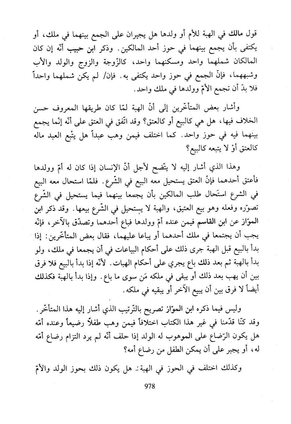 وهذا الذي أشار إليه لا يتضح لأجل أنّ الإنسان إذا كان له أمّ وولدها فأعتق أحدهما فإن العتق يستحيل معه البيع في الشّرع. فلمّا استحال معه البيع في الشرع استَحال طلب المالكين بأن يجمعا بينهما فيما يستحيل في الشّرع تصوّره وفعله وهو بيع العتيق، والهبة لا يستحيل في الشّرع بيعها. وقد ذكر ابن الموّاز عن ابن القاسم فيمن عنده أمّ وولدها فباع أحدهما وتصدّق بالآخر، فإته يجب أن يجتمعا في ملك أحدهما أو يباعا عليهما، فقال بعض المتأخّرين: إذا بدأ بالبيع قبل الهبة جرى ذلك على أحكام البياعات في أن يجمعا في ملك، ولو بدأ بالهبة ثم بعد ذلك باع يجري على أحكام الهبات. لأنّه إذا بدأ بالبيع فلا فرق بين أن يهب بعد ذلك أو يبقى في ملكه مَن سوى ما باع. وإذا بدأ بالهبة فكذلك أيضًا لا فرق بين أن يبيع الآخر أو يبقيه في ملكه.