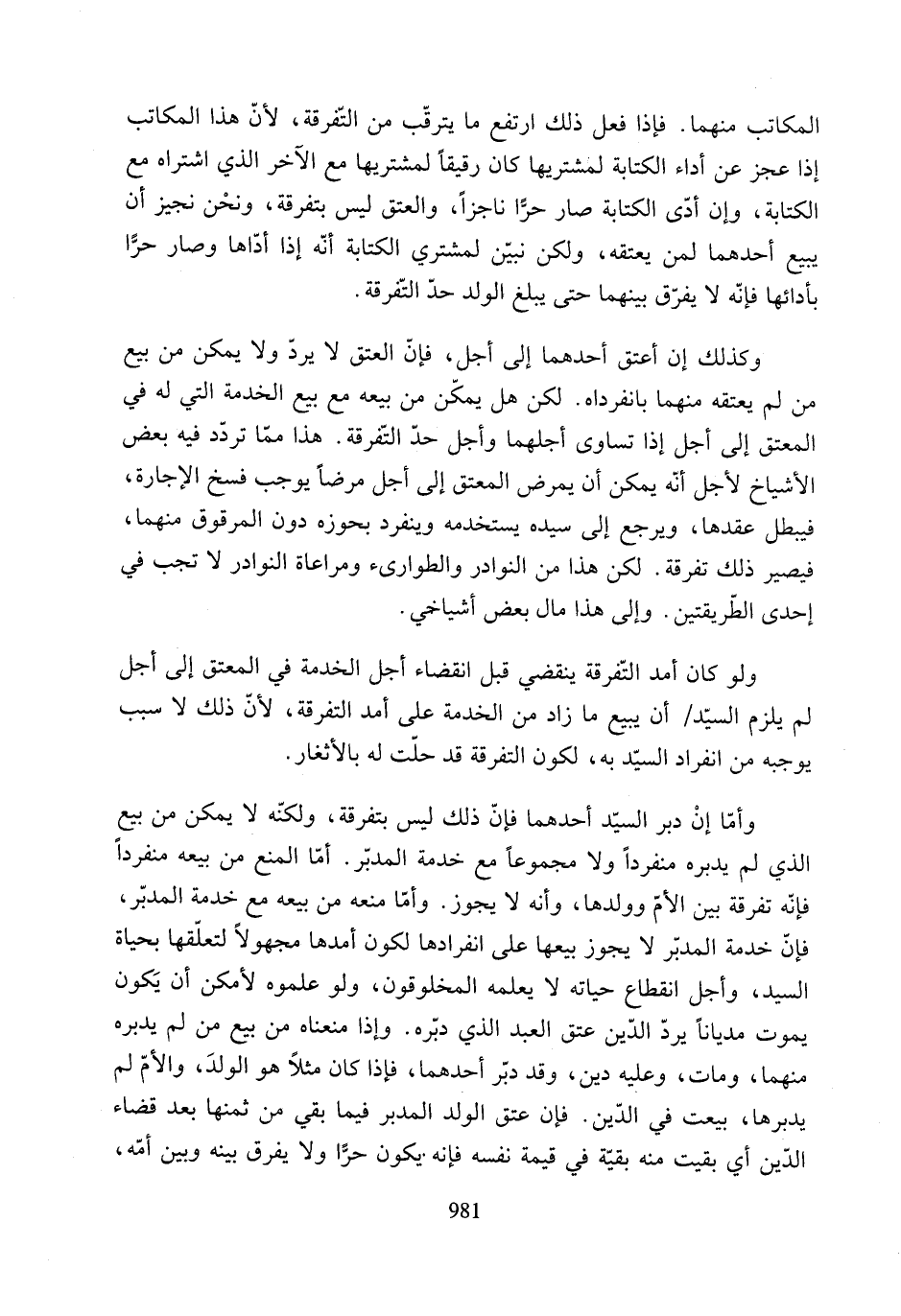 وأمّا إنْ دبر السيّد أحدهما فإنّ ذلك ليس بتفرقة، ولكنّه لا يمكن من بيع الذي لم يدبره منفردًا ولا مجموعًا مع خدمة المدبّر. أمّا المنع من بيعه منفردًا فإنّه تفرقة بين الأمّ وولدها، وأنه لا يجوز. وأمّا منعه من بيعه مع خدمة المدبّر، فإنّ خدمة المدبّر لا يجوز بيعها على انفرادها لكون أمدها مجهولًا لتعلّقها بحياة السيد، وأجل انقطاع حياته لا يعلمه المخلوقون، ولو علموه لأمكن أن يَكون يموت مديانًا يردّ الدّين عتق العبد الذي دبّره. وإذا منعناه من بيع من لم يدبره منهما، ومات، وعليه دين، وقد دبّر أحدهما، فإذا كان مثلًا هو الولدَ، والأمّ لم يدبرها، بيعت في الدّين. فإن عتق الولد المدبر فيما بقي من ثمنها بعد قضاء الدّين أي بقيت منه بقيّة في قيمة نفسه فإنه. يكون حرًّا ولا يفرق بينه وبين أمّه،