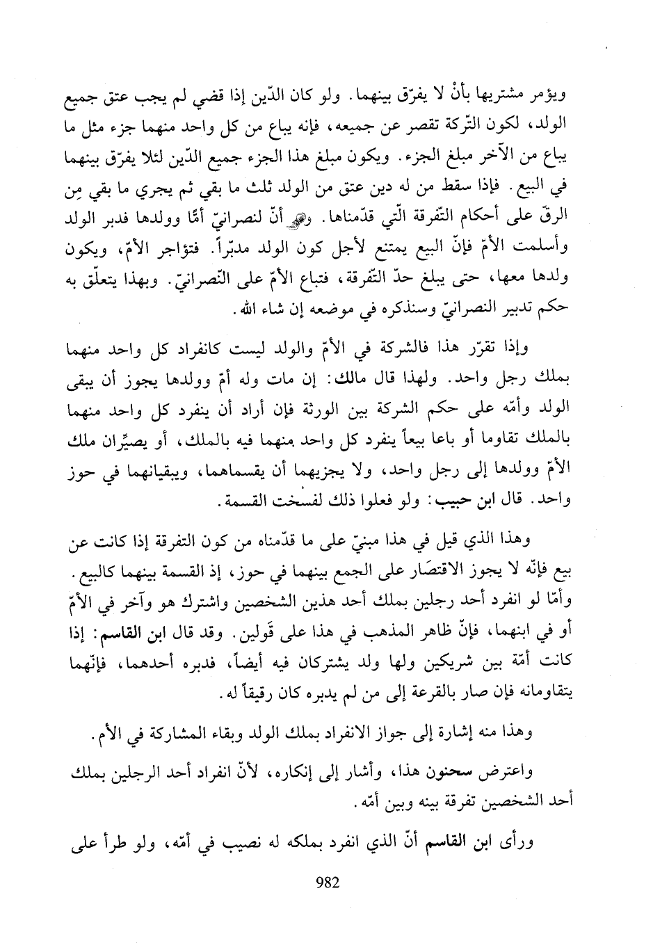 واعترض سحنون هذا، وأشار إلى إنكاره؛ لأنّ انفراد أحد الرجلين بملك أحد الشخصين تفرقة بينه وبين أمّه.