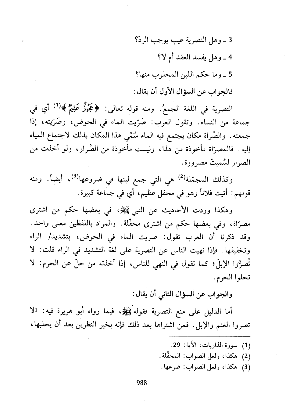 التصرية في اللغة الجمعُ. ومنه قوله تعالى: {عَجُوزٌ عَقِيمٌ} (¬1) أي في جماعة من النساء. وتقول العرب: صَرّيت الماء في الحوض، وصَرَيته، إذا جمعته. والصَّراة مكان يجتمع فيه الماء سُمِّي هذا المكان بذلك لاجتماع المياه إليه. فالمصراة مأخوذة من هذا, وليست مأخوذة من الصَّرار، ولو أخذت من الصرار لسُميتْ مصرورة.