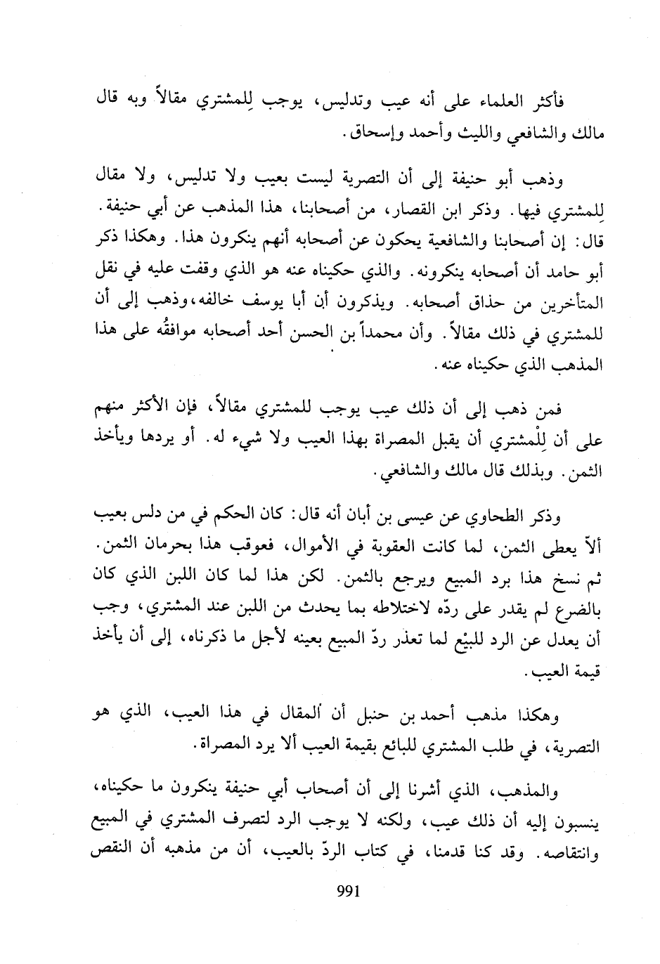 والمذهب، الذي أشرنا إلى أن أصحاب أبي حنيفة ينكرون ما حكيناه، ينسبون إليه أن ذلك عيب، ولكنه لا يوجب الرد لتصرف المشتري في المبيع وانتقاصه. وقد كنا قدمنا، في كتاب الرد بالعيب، أن من مذهبه أن النقص