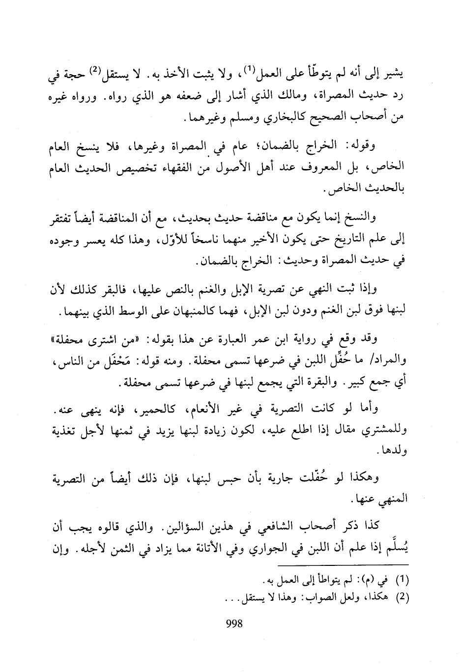 والنسخ إنما يكون مع مناقضة حديث بحديث، مع أن المناقضة أيضًا تفتقر إلى علم التاريخ حتى يكون الأخير منهما ناسخًا للأوّل، وهذا كله يعسر وجوده في حديث المصراة وحديث: الخراج بالضمان.