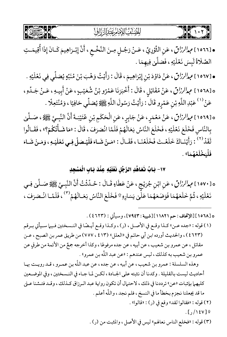 ° [١٥٦٨] عبد الرزاق، عَنْ مُقَاتِلٍ، قَالَ: أَخْبَرَنَا عَمْرُو بْن شُعَيْبٍ، عَنْ أَبِيهِ، عَنْ جَدِّهِ، عَنْ (¬١) عَبْدِ اللهِ بْنِ عَمْرٍو قَالَ: رَأَيْتُ رَسُولَ اللَّهِ - صلى الله عليه وسلم - يُصَلِّي حَافِيًا، وَمُنْتَعِلًا.