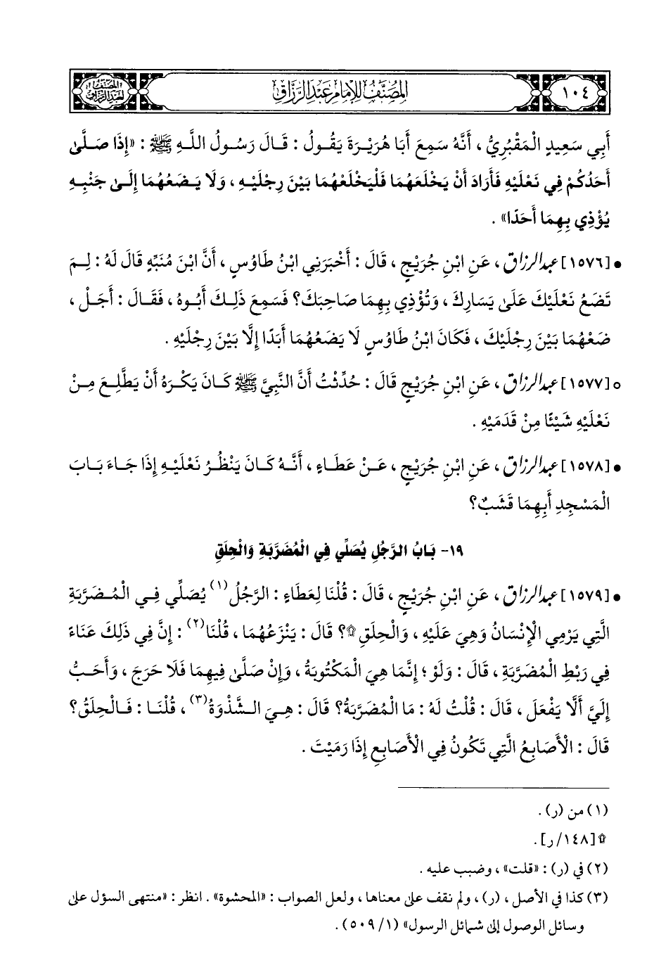 ° [١٥٧٧] عبد الرزاق، عَنِ ابْنِ جُرَيْجٍ قَالَ: حُدِّثْتُ أَنَّ النَّبِي - صلى الله عليه وسلم - كَانَ يَكْرَهُ أَنْ يَطَّلِعَ مِنْ نَعْلَيْهِ شَيْئًا مِنْ قَدَمَيْهِ.