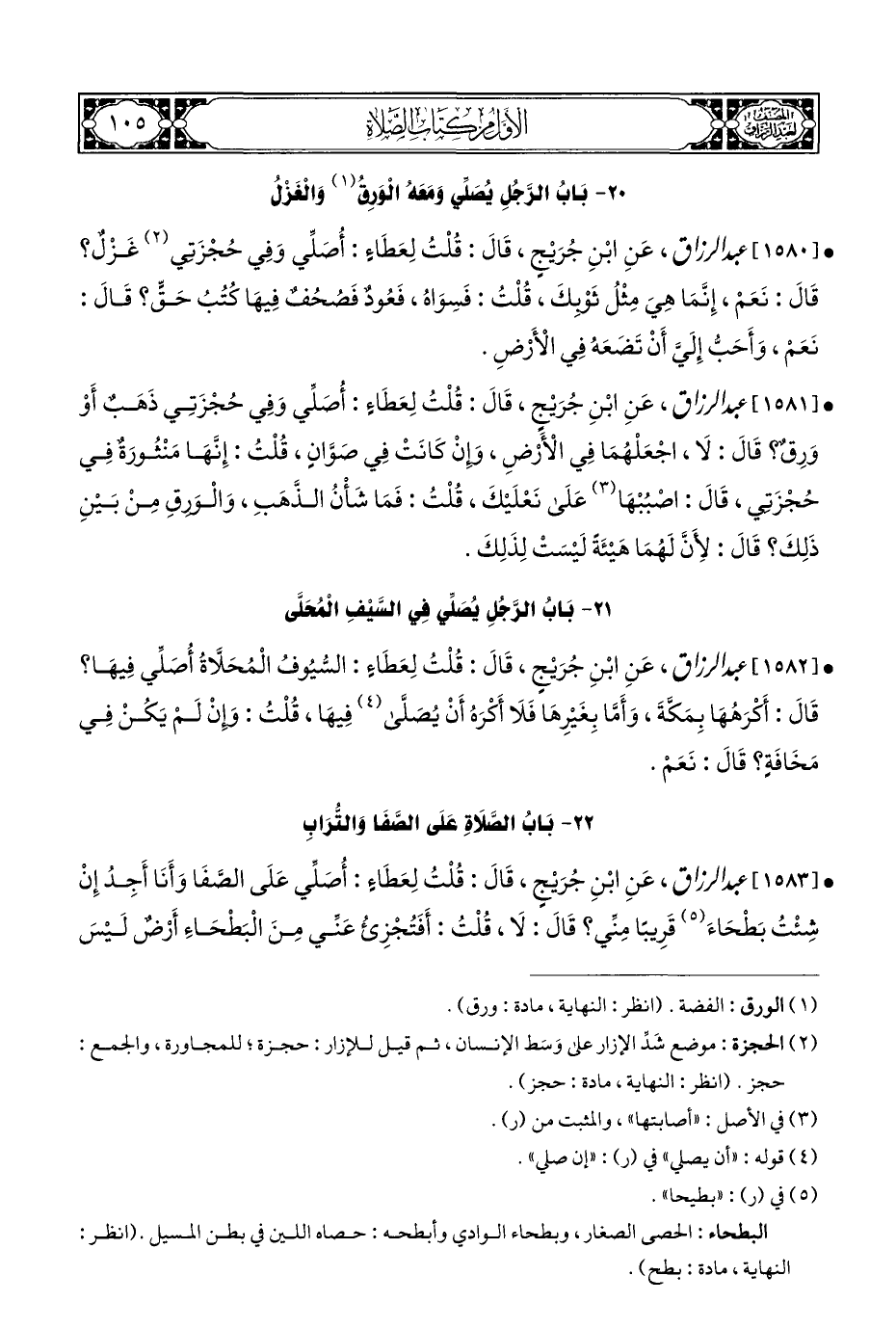 • [١٥٨١] عبد الرزاق، عَنِ ابْنِ جُرَيْجٍ، قَالَ: قُلْتُ لِعَطَاء: أُصَلِّي وَفِي حُجْزَتِي ذَهَبٌ أَوْ وَرِقٌ؟ قَالَ: لَا، اجْعَلْهُمَا فِي الْأَرْضِ، وإِنْ كَانَتْ فِي صَوَّانٍ، قُلْتُ: إِنَّهَا مَنْثُورَةٌ فِي حُجْزَتي، قَالَ: اصْبُبْهَا (¬٣) عَلَى نَعْلَيْكَ، قُلْتُ: فَمَا شَأْنُ الذَّهَبِ، وَالْوَرِقِ مِنْ بَيْنِ ذَلِكَ؟ قَالَ: لِأَنَّ لَهُمَا هَيْئَةً لَيْسَتْ لِذَلِكَ.
