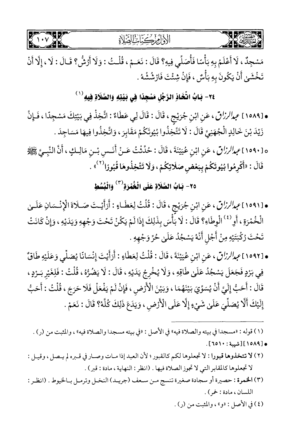 • [١٥٨٩] عبد الرزاق، عَنِ ابْنِ جُرَيْجٍ، قَالَ: قَالَ لِي عَطَاءٌ: اتَّخِذْ فِي بَيْتِكَ مَسْجِدًا، فَإِنَّ زَيْدَ بْنَ خَالِدٍ الْجُهَنِيَّ قَالَ: لَا تَتَّخِذُوا بُيُوتَكُمْ مَقَابِرَ، وَاتَّخِذُوا فِيهَا مَسَاجِدَ.