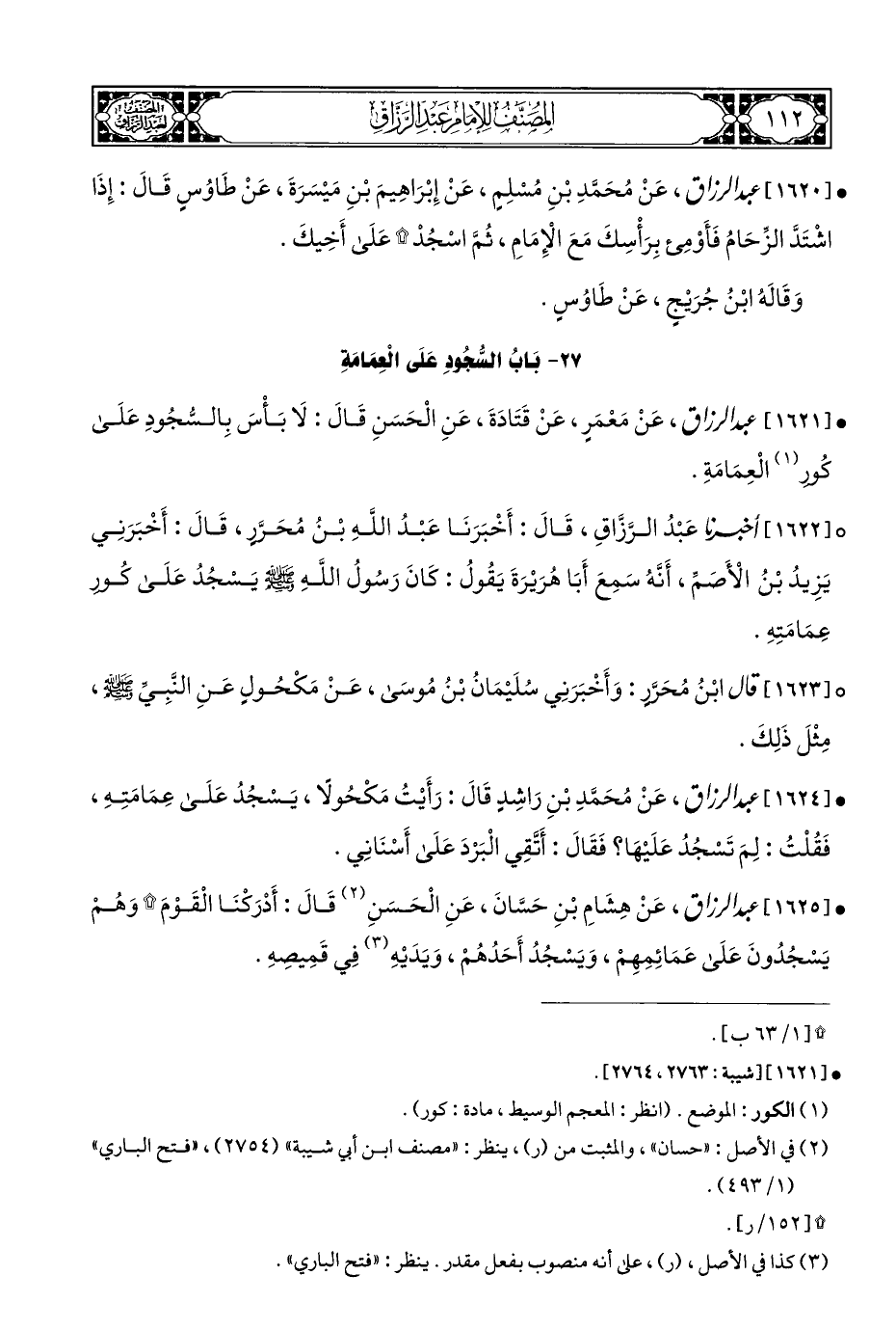 ° [١٦٢٢] أخبرنا عَبْدُ الرَّزَّاقِ، قَالَ: أَخْبَرَنَا عَبْدُ اللهِ بْنُ مُحَرَّرٍ، قَالَ: أَخْبَرَنِي يَزِيدُ بْنُ الْأَصَمِّ، أَنَّهُ سَمِعَ أَبَا هُرَيْرَةَ يَقُولُ: كَانَ رَسُولُ اللَّهِ - صلى الله عليه وسلم - يَسْجُدُ عَلَى كُورِ عِمَامَتِهِ.