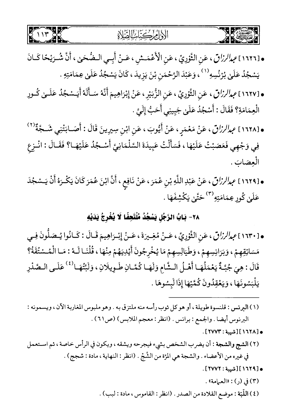 • [١٦٢٩] عبد الرزاق، عَنْ عَبْدِ اللَّهِ بْنِ عُمَرَ، عَنْ نَافِعٍ، أَنَّ ابْنَ عُمَرَ كَانَ يَكْرَهُ أَنْ يَسْجُدَ عَلَى كُورِ عِمَامَتِهِ (¬٣) حَتَّى يَكْشِفَهَا.