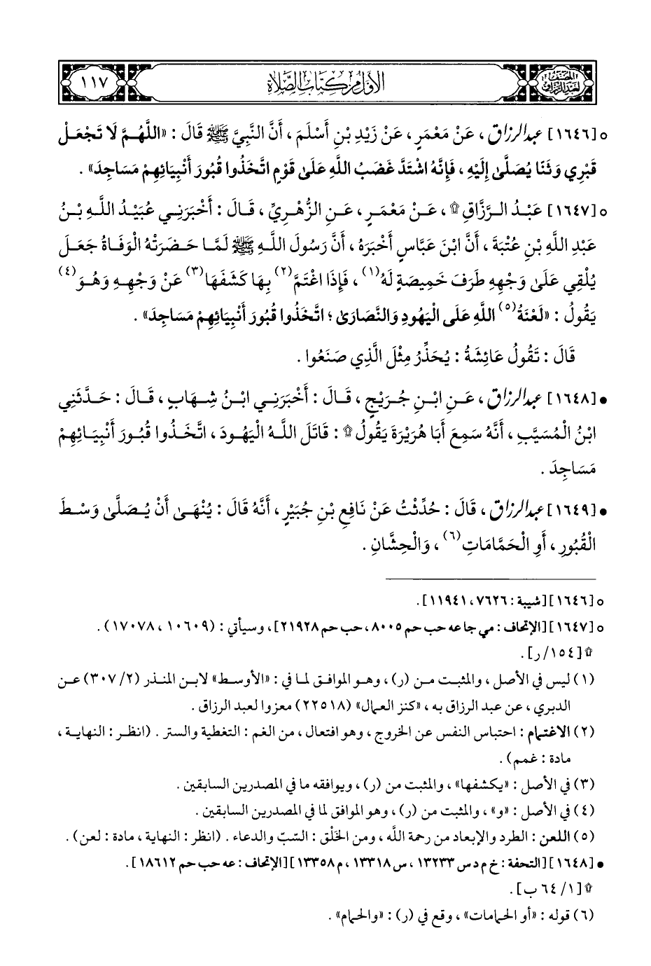 ° [١٦٤٦] عبد الرزاق، عَنْ مَعْمَرٍ، عَنْ زَيْدِ بْنِ أَسْلَمَ، أَنَّ النَّبِيَّ - صلى الله عليه وسلم - قالَ: "اللَّهُمَّ لَا تَجْعَلْ قَبْرِي وَثَنًا يُصَلَّى إِلَيْهِ، فَإِنَّهُ اشْتَدَّ غَضَبُ اللهِ عَلَى قَوْمٍ اتَّخَذُوا قُبُورَ أَنْبِيَائِهِمْ مَسَاجِدَ".