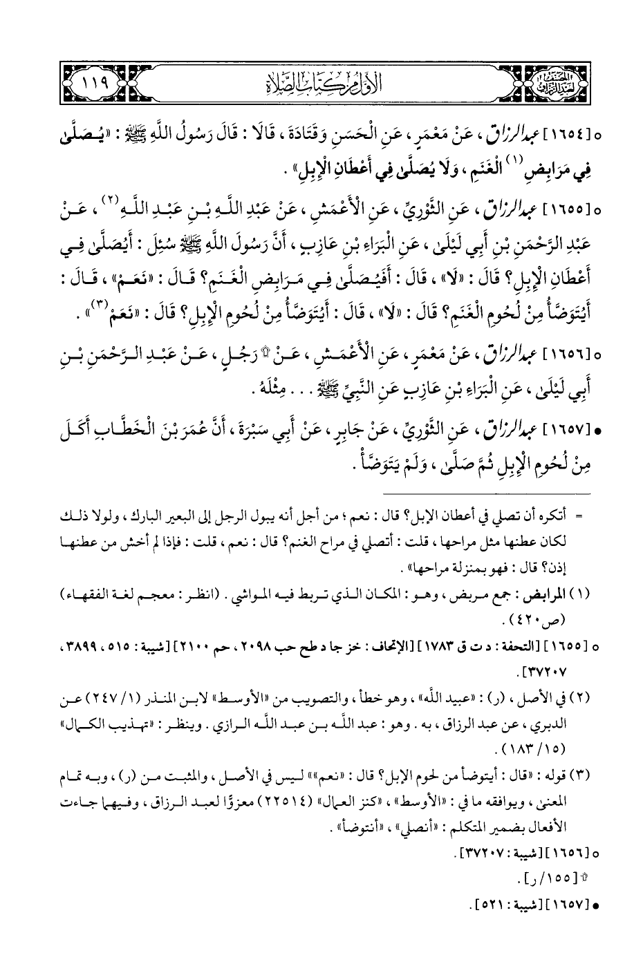 ° [١٦٥٥] عبد الرزاق، عَنِ الثَّوْريِّ، عَنِ الْأَعْمَشِ، عَنْ عَبْدِ اللَّهِ بْنِ عَبْدِ اللَّهِ (¬٢)، عَنْ عَبْدِ الرَّحْمَنِ بْنِ أَبِي لَيلَى، عَنِ الْبَرَاءِ بْنِ عَازِبٍ، أَنَّ رَسُولَ اللَّهِ - صلى الله عليه وسلم - سُئِلَ: أَيُصَلَّى فِي أَعْطَانِ الْإِبِلِ؟ قَالَ: "لَا"، قَالَ: أَفَيُصَلَّى فِي مَرَابِضِ الْغَنَمِ؟ قَالَ: "نَعَمْ"، قَالَ: أَيُتَوَضَّأُ مِنْ لُحُومِ الْغَنَمِ؟ قَالَ: "لَا"، قَالَ: أَيُتَوَضَّأُ مِنْ لُحُومِ الْإِبِلِ؟ قَالَ: "نَعَمْ (¬٣) ".