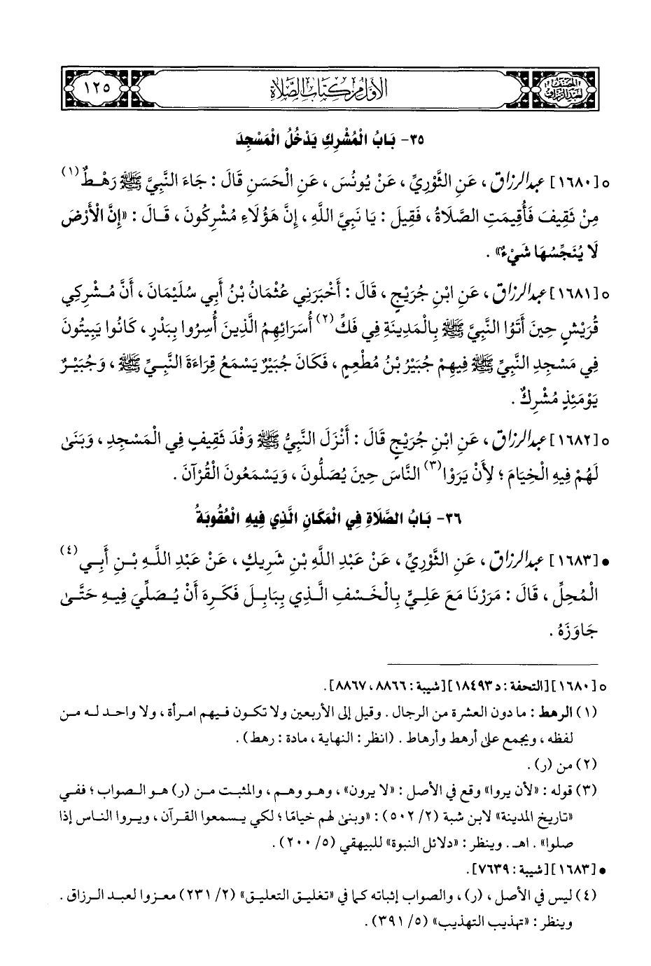 ° [١٦٨٢] عبد الرزاق، عَنِ ابْنِ جُرَيْجٍ قَالَ: أَنْزَلَ النَّبِيُّ - صلى الله عليه وسلم - وَفْدَ ثَقِيفٍ فِي الْمَسجِدِ، وَبَنَى لَهُمْ فِيهِ الْخِيَامَ؛ لِأَنْ يَرَوْا (¬٣) النَّاسَ حِينَ يُصَلُّونَ، وَيَسْمَعُونَ الْقُرآنَ.