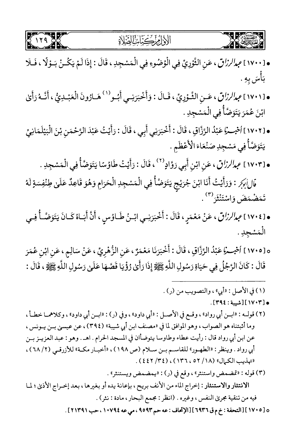 • [١٧٠٣] عبد الرزاق، عَنِ ابْنِ أَبِي رَوَّادٍ (¬٢)، قَالَ: رَأَيْتُ طَاوُسًا يَتَوَضَّأُ فِي الْمَسْجِدِ.