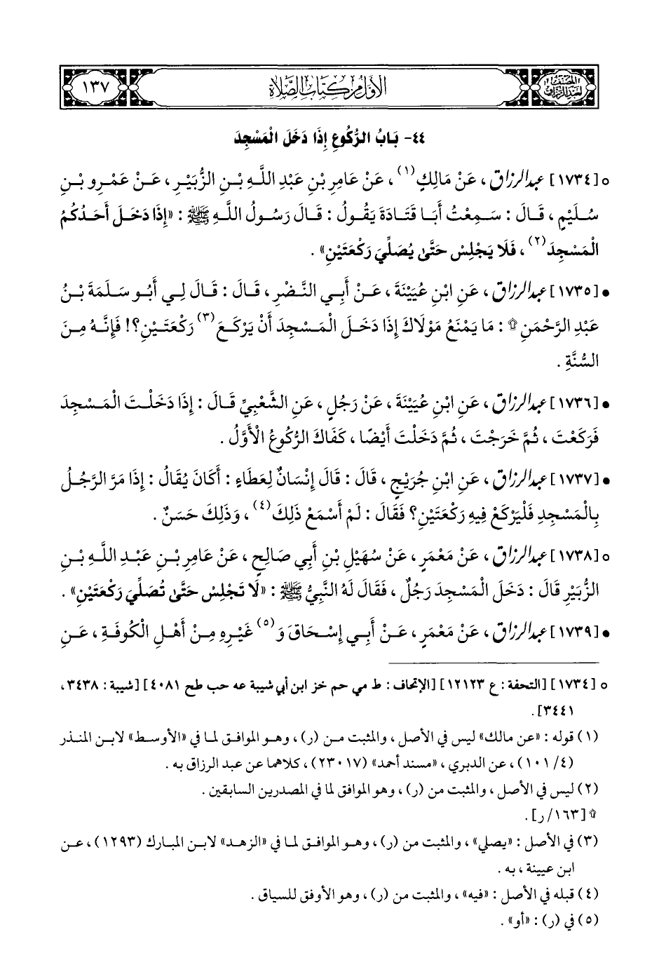 ° [١٧٣٤] عبد الرزاق، عَنْ مَالِكٍ (¬١)، عَنْ عَامِرِ بْنِ عَبْدِ اللَّهِ بْنِ الزُّبَيْرِ، عَنْ عَمْرِو بْنِ سُلَيْمٍ، قَالَ: سَمِعْتُ أَبَا قَتَادَةَ يَقُولُ: قَالَ رَسُولُ اللَّهِ - صلى الله عليه وسلم -: "إِذَا دَخَلَ أَحَدُكُمُ الْمَسْجِدَ (¬٢)، فَلَا يَجْلِسْ حَتَّى يُصَلِّيَ رَكْعَتَيْنِ".