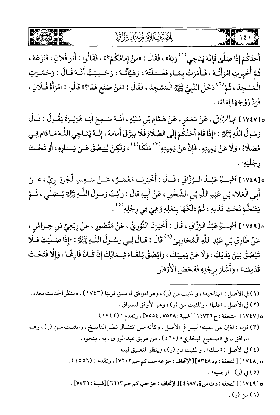 ° [١٧٤٩] أخبرنا عَبْدُ الرَّزَّاقِ، قَالَ: أَخْبَرَنَا مَعْمَرٌ، عَنْ سَعِيدٍ الْجُرَيْرِيِّ، عَنْ أَبِي الْعَلَاءِ بْنِ عَبْدِ اللَّهِ بْنِ الشِّخِّيرِ، عَنْ أبِيهِ قَالَ: رَأَيْتُ رَسُولَ اللَّهِ - صلى الله عليه وسلم - يُصَلِّي، ثُمَّ يَتَنَخَّمُ تَحْتَ قَدَمِهِ، ثُمَّ دَلَكَهَا بِنَعْلِهِ وَهِيَ فِي رِجْلِهِ (¬٥).