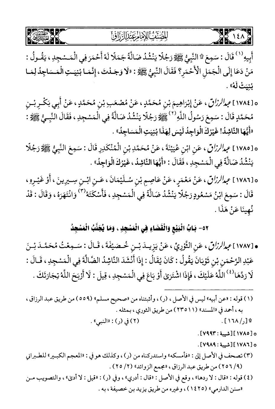 ° [١٧٨٥] عبد الرزاق، عَنِ ابْنِ عُيَيْنَةَ، عَنْ مُحَمَّدِ بْنِ الْمُنْكَدِرِ قَالَ: سَمِعَ النَّبِيُّ - صلى الله عليه وسلم - رَجُلًا يَنْشُدُ ضَالَّةً فِي الْمَسْجِدِ، فَقَالَ: "أَيُّهَا النَّاشِدُ، غَيْرُكَ الْوَاجِدُ".