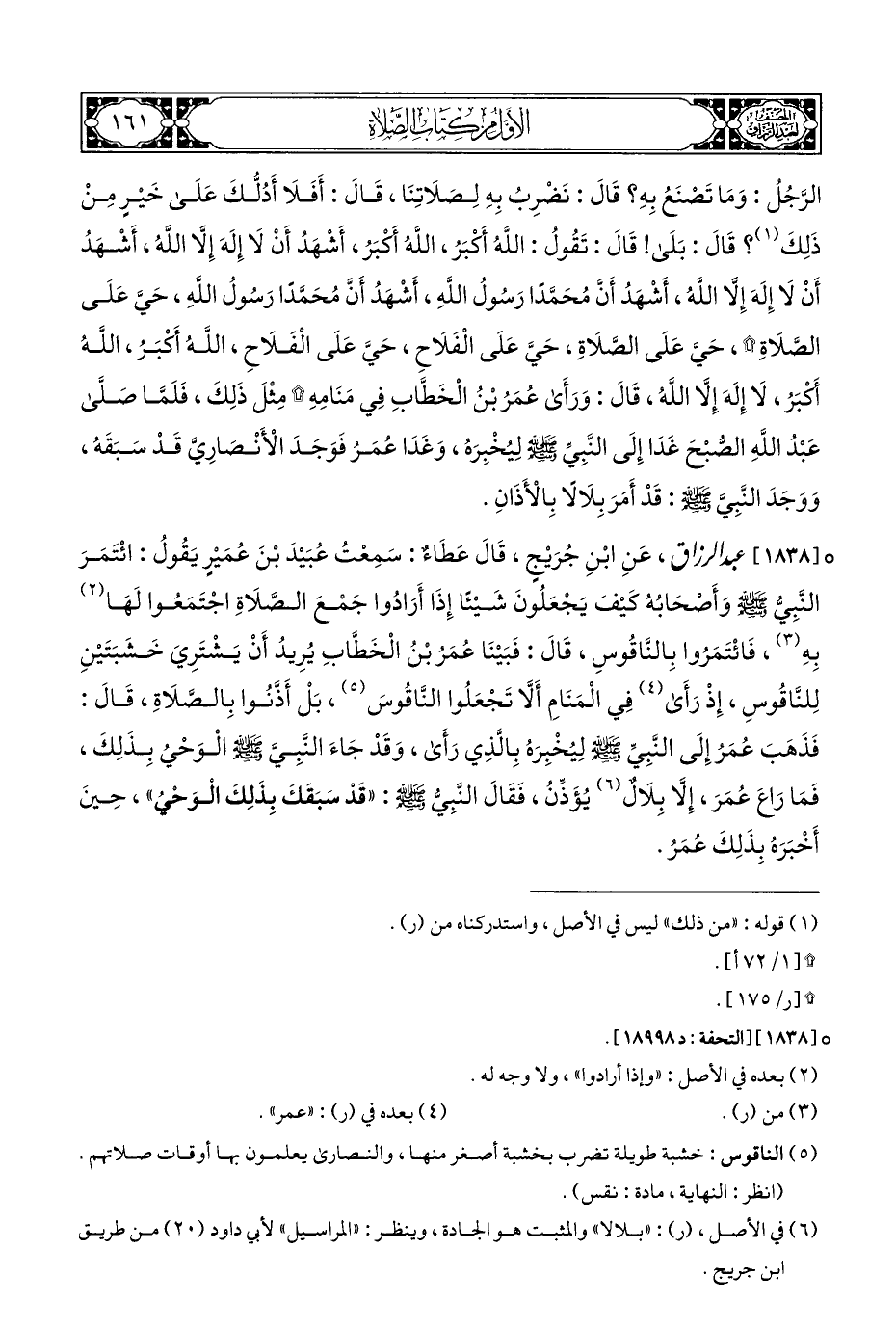 ° [١٨٣٨] عبد الرزاق، عَنِ ابْنِ جُرَيْجٍ، قَالَ عَطَاءٌ: سَمِعْتُ عُبَيْدَ بْنَ عُمَيْرٍ يَقُولُ: ائْتَمَرَ النَّبِيُّ - صلى الله عليه وسلم - وَأَصْحَابُهُ كَيْفَ يَجْعَلُونَ شَيْئًا إِذَا أَرَادُوا جَمْعَ الصَّلَاةِ اجْتَمَعُوا لَهَا (¬٢) بِهِ (¬٣) , فَائْتَمَرُوا بِالنَّاقُوسِ، قَالَ: فَبَيْنَا عُمَرُ بْنُ الْخَطَّابِ يُرِيدُ أَنْ يَشْتَرِيَ خَشَبَتَيْنِ لِلنَّاقُوسِ، إِذْ رَأَى (¬٤) فِي الْمَنَامِ أَلَّا تَجْعَلُوا النَّاقُوسَ (¬٥)، بَلْ أَذَّنُوا بِالصَّلَاةِ، قَالَ: فَذَهَبَ عُمَرُ إِلَى النُّبِيِّ - صلى الله عليه وسلم - لِيُخْبِرَهُ بِالَّذِي رَأَى، وَقَدْ جَاءَ النَّبِيَّ - صلى الله عليه وسلم - الْوَحْيُ بِذَلِكَ، فَمَا رَاعَ عُمَرَ، إِلَّا بِلَالٌ (¬٦) يُؤَذِّنُ، فَقَالَ النَّبِيُّ - صلى الله عليه وسلم -: "قَدْ سَبَقَكَ بِذَلِكَ الْوَحْيُ"، حِينَ أَخْبَرَهُ بِذَلِكَ عُمَرُ.
