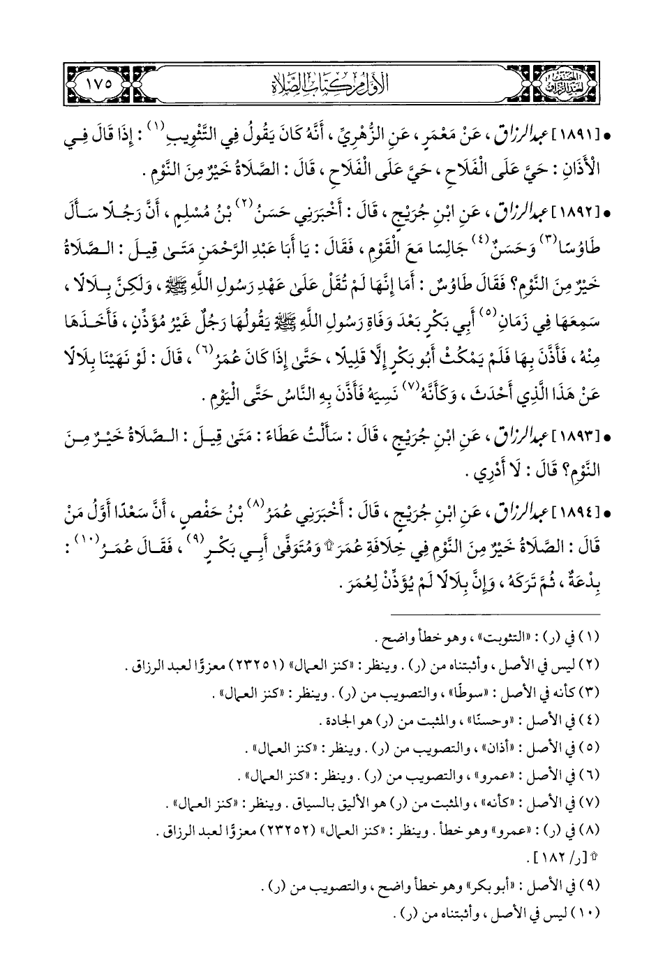 • [١٨٩٢] عبد الرزاق، عَنِ ابْنِ جُرَيْجٍ، قَالَ: أَخْبَرَنِي حَسَنُ (¬٢) بْنُ مُسْلِمٍ، أَنَّ رَجُلًا سَأَلَ طَاوُسًا (¬٣) وَحَسَنٌ (¬٤) جَالِسًا مَعَ الْقَوْمِ، فَقَالَ: يَا أَبَا عَبْدِ الرَّحْمَنِ مَتَى قِيلَ: الصَّلَاةُ خَيْرٌ مِنَ النَّوْمِ؟ فَقَالَ طَاوُسٌ: أَمَا إِنَّهَا لَمْ تُقَلْ عَلَى عَهْدِ رَسُولِ اللهِ - صلى الله عليه وسلم -، وَلَكِنَّ بِلَالًا، سَمِعَهَا فِي زَمَانِ (¬٥) أَبِي بَكْرٍ بَعْدَ وَفَاةِ رَسُولِ اللَّهِ - صلى الله عليه وسلم - يَقُولُهَا رَجُل غَيْرُ مُؤَذنٍ، فَأَخَذَهَا مِنْهُ، فَأَذَّنَ بِهَا فَلَمْ يَمْكُثْ أَبُو بَكْرٍ إِلَّا قَلِيلًا، حَتَّى إِذَا كَانَ عُمَرُ (¬٦)، قَالَ: لَوْ نَهَيْنَا بِلَالًا عَنْ هَذَا الَّذِي أَحْدَثَ، وَكَأَنَّهُ (¬٧) نَسِيَهُ فَأَذَّنَ بِهِ النَّاسُ حَتَّى الْيَوْمِ.