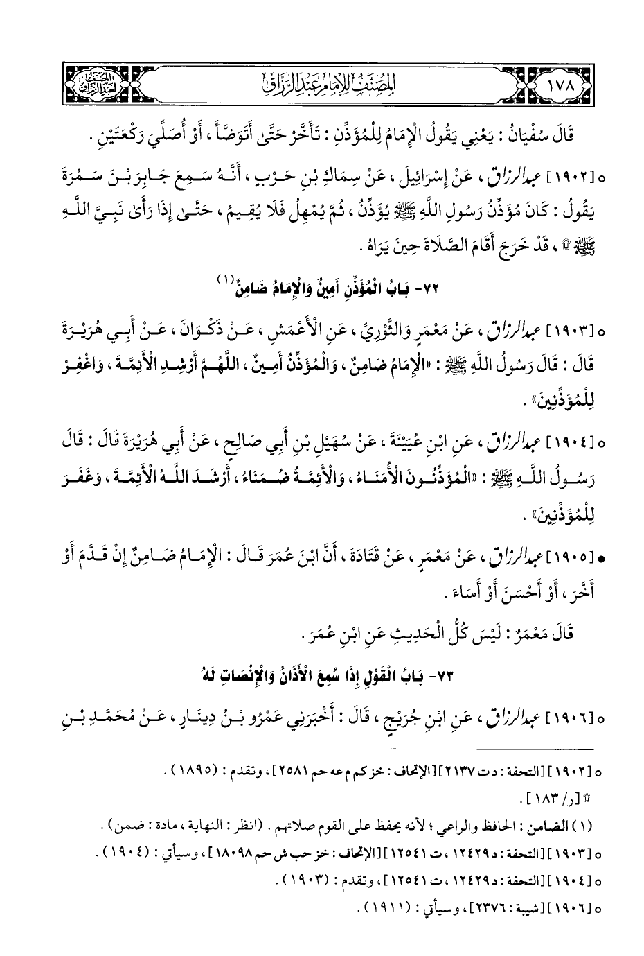 ° [١٩٠٣] عبد الرزاق، عَنْ مَعْمَرٍ وَالثَّوْرِيِّ، عَنِ الْأَعْمَشِ، عَنْ ذَكْوَانَ، عَنْ أَبِي هُرَيْرَةَ قَالَ: قَالَ رَسُولُ اللَّهِ - صلى الله عليه وسلم -:"الْإِمَامُ ضَامِنٌ، وَالْمُؤَذِّنُ أَمِينٌ، اللَّهُمَّ أَرْشِدِ الْأَئِمَّةَ، وَاغْفِرْ لِلْمُؤَذِّنِينَ".