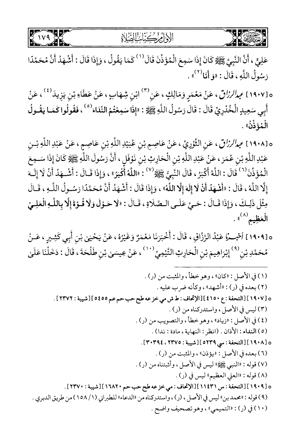 ° [١٩٠٨] عبد الرزاق، عَنِ الثَّوْرِيِّ، عَنْ عَاصِمِ بْنِ عُبَيْدِ اللَّهِ بْنِ عَاصِمٍ، عَنْ عَبْدِ اللَّهِ بْنِ عَبْدِ اللَّهِ بْنِ عُمَرَ، عَنْ عَبْدِ اللَّهِ بْنِ الْحَارِثِ بْنِ نَوْفَلٍ، أَنَّ رَسُولَ اللَّهِ - صلى الله عليه وسلم - كَانَ إِذَا سَمِعَ الْمُؤَذِّنَ (¬٦) قَالَ: اللَّهُ أَكْبَرُ، قَالَ النَّبِيُّ - صلى الله عليه وسلم - (¬٧): "اللَّهُ أكبَرُ"، وإِذَا قَالَ: أَشْهَدُ أَنْ لَا إِلَهَ إِلَّا اللَّهُ، قَالَ: "أَشْهَدُ أَنْ لَا إِلَهَ إِلَّا اللَّهُ"، وإِذَا قَالَ: أَشْهَدُ أَنَّ مُحَمَّدًا رَسُولُ اللَّهِ، قَالَ مِثْلَ ذَلِكَ، وإِذَا قَالَ: حَيَّ عَلَى الصَّلَاةِ، قَالَ: "لَا حَوْلَ وَلَا قُوَّةَ إِلَّا بِاللَّهِ العَلِيِّ الْعَظِيمِ (¬٨) ".