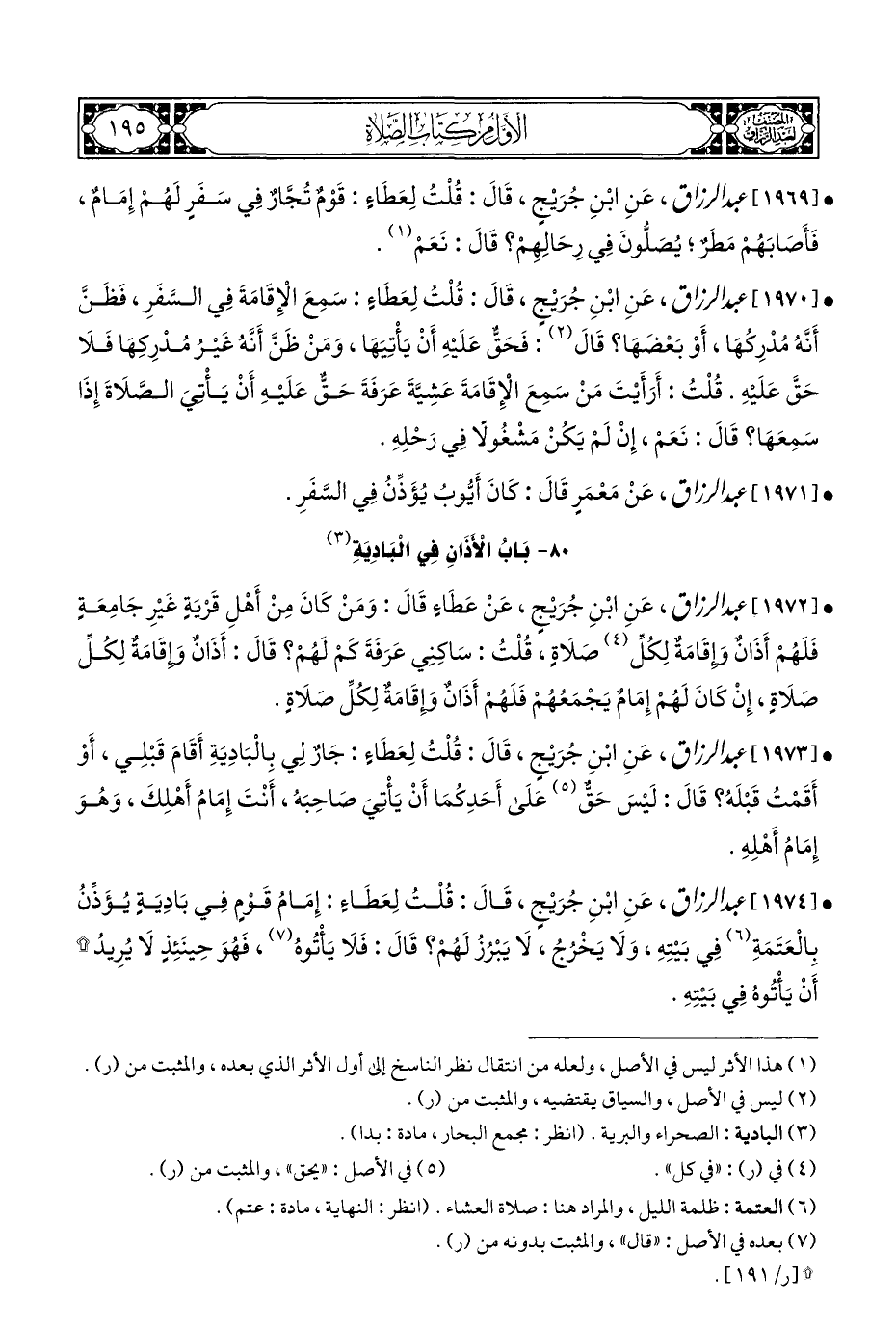 • [١٩٦٩] عبد الرزاق، عَنِ ابْنِ جُرَيْجٍ، قَالَ: قُلْتُ لِعَطَاءٍ: قَوْمٌ تُجَّارٌ فِي سَفَرٍ لَهُمْ إِمَامٌ، فَأَصَابَهُمْ مَطَرٌ؛ يُصَلُّونَ فِي رِحَالِهِمْ؟ قَالَ: نَعَمْ (¬١).