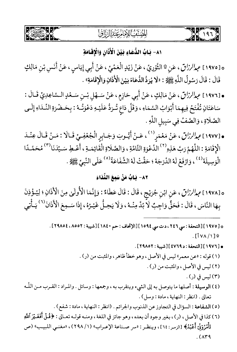 • [١٩٧٧] عبد الرزاق، عَنْ مَعْمَرٍ (¬١)، عَنْ أَيُّوبَ وَجَابِرِ الْجُعْفِيِّ قَالَا: مَنْ قَالَ عِنْدَ الْإِقَامَةِ: اللَّهُمَّ رَبَّ هَذِهِ (¬٢) الدَّعْوَةِ التُّامَّةِ، وَالصَّلَاةِ الْقَائِمَةِ، أَعْطِ سَيِّدَنَا (¬٣) مُحَمَّدًا الْوَسِيلَةَ (¬٤)، وَارفَعْ لَهُ الدَّرَجَةَ؛ حَقَّتْ لَهُ الشَّفَاعَةُ (¬٥) عَلَى النَّبِيِّ - صلى الله عليه وسلم -.