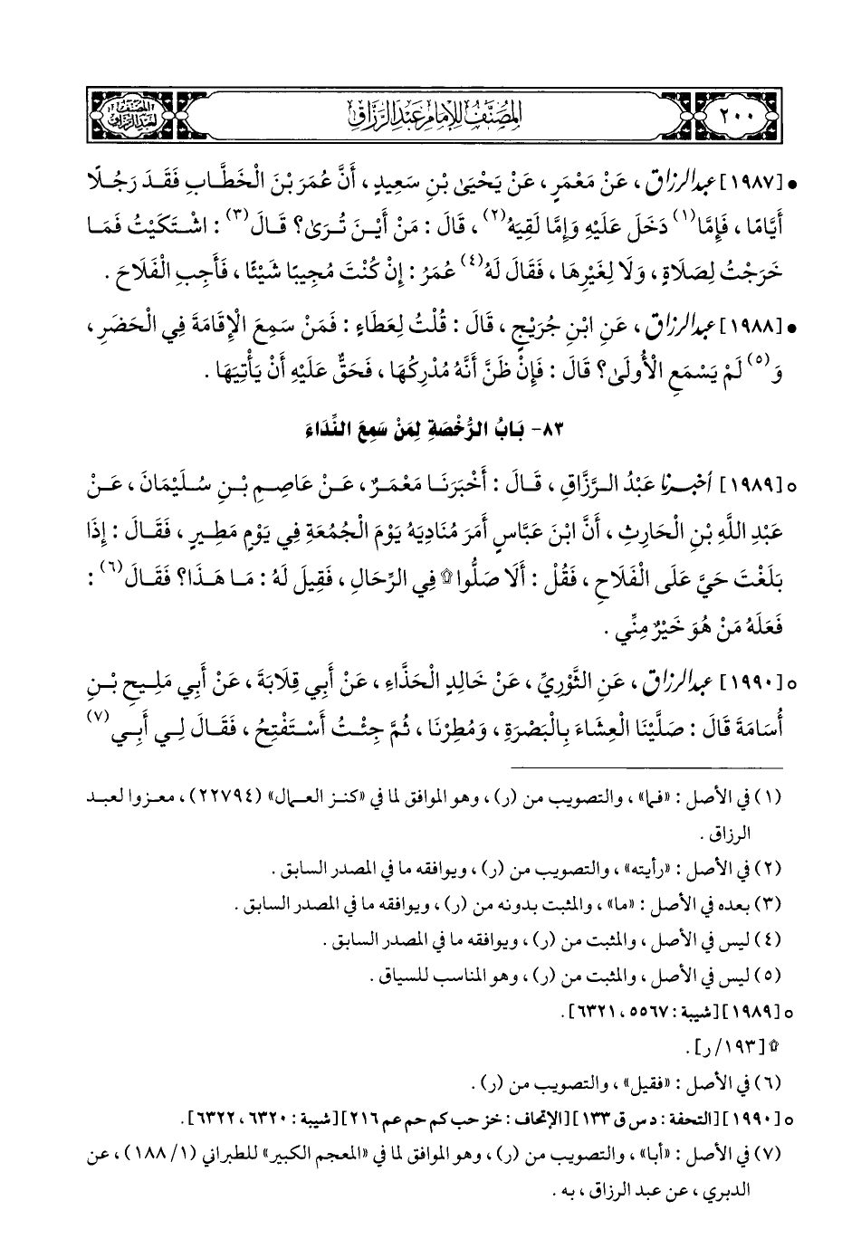 ° [١٩٨٩] أخبرنا عَبْدُ الرَّزَّاقِ، قَالَ: أَخْبَرَنَا مَعْمَرٌ، عَنْ عَاصِمِ بْنِ سُلَيْمَانَ، عَنْ عَبْدِ اللَّهِ بْنِ الْحَارِثِ، أَنَّ ابْنَ عَبَّاسٍ أَمَرَ مُنَادِيَهُ يَوْمَ الْجُمُعَةِ فِي يَوْمٍ مَطِيرٍ، فَقَالَ: إِذَا بَلَغْتَ حَيَّ عَلَى الْفَلَاحِ، فَقُلْ: أَلَا صَلُّوا * فِي الرِّحَالِ، فَقِيلَ لَهُ: مَا هَذَا؟ فَقَالَ (¬٦): فَعَلَهُ مَنْ هُوَ خَيْرٌ مِنِّي.