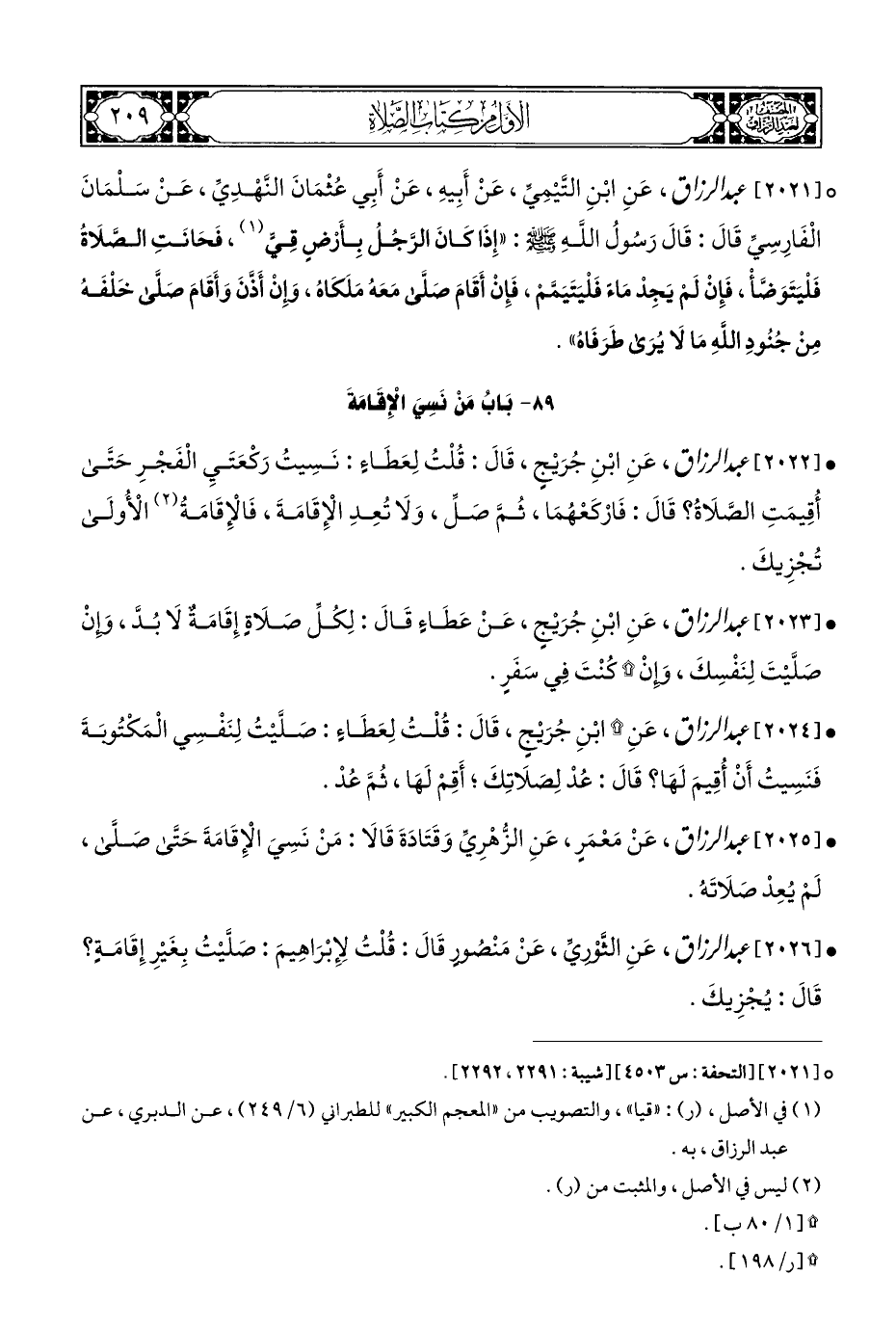 • [٢٠٢٦] عبد الرزاق، عَنِ الثَّوْرِيِّ، عَنْ مَنْصُورٍ قَالَ: قُلْتُ لإِبْرَاهِيمَ: صَلَّيْتُ بِغَيْرِ إِقَامَةٍ؟ قَالَ: يُجْزِيكَ.