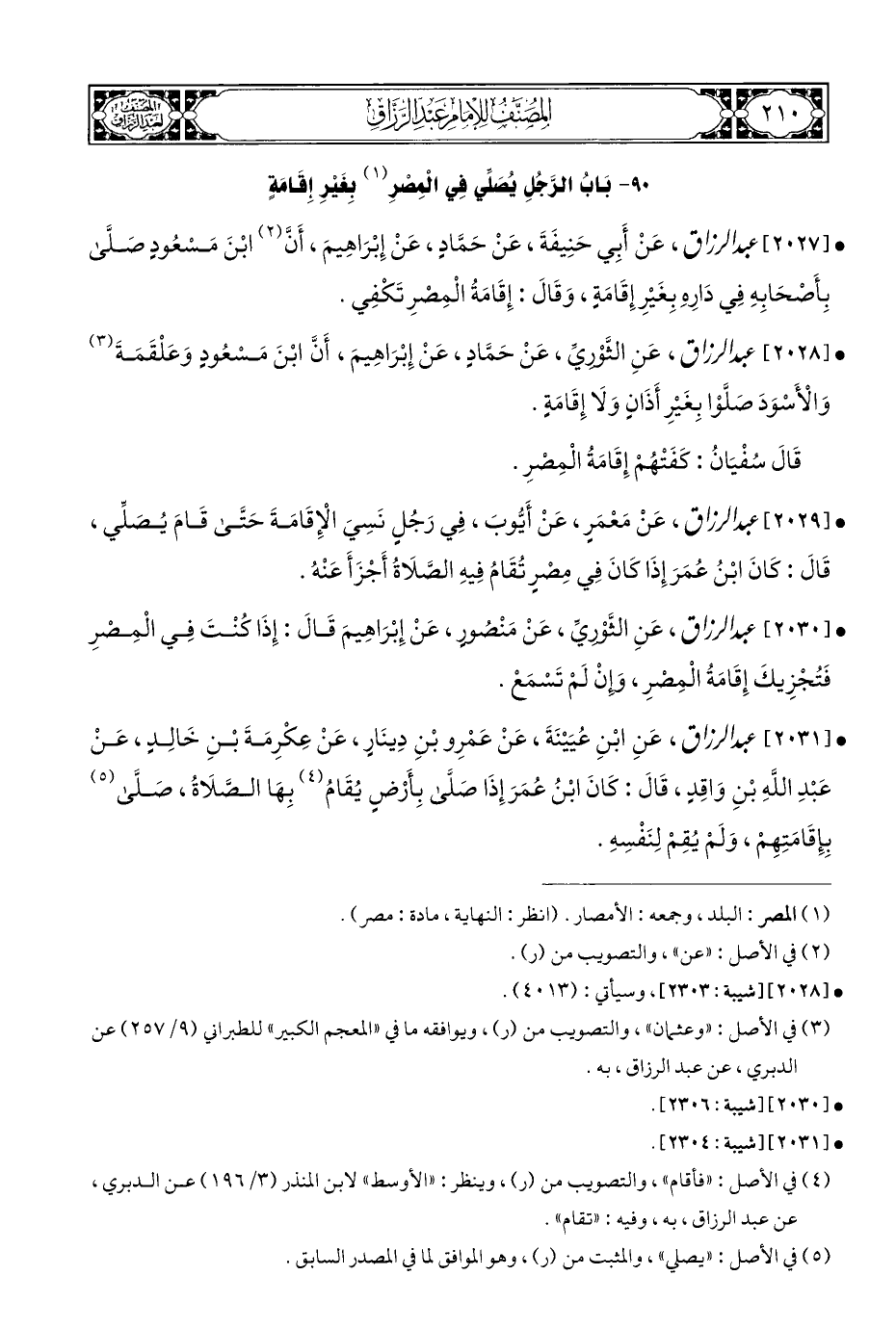 • [٢٠٢٧] عبد الرزاق، عَنْ أَبِي حَنِيفَةَ، عَنْ حَمَّادٍ، عَنْ إبْرَاهِيمَ، أَنَّ (¬٢) ابْنَ مَسْعُودٍ صَلَّى بِأَصْحَابِهِ فِي دَارِهِ بِغَيْرِ إِقَامَةِ، وَقَالَ: إِقَامَةُ الْمِصرِ تَكْفِي.