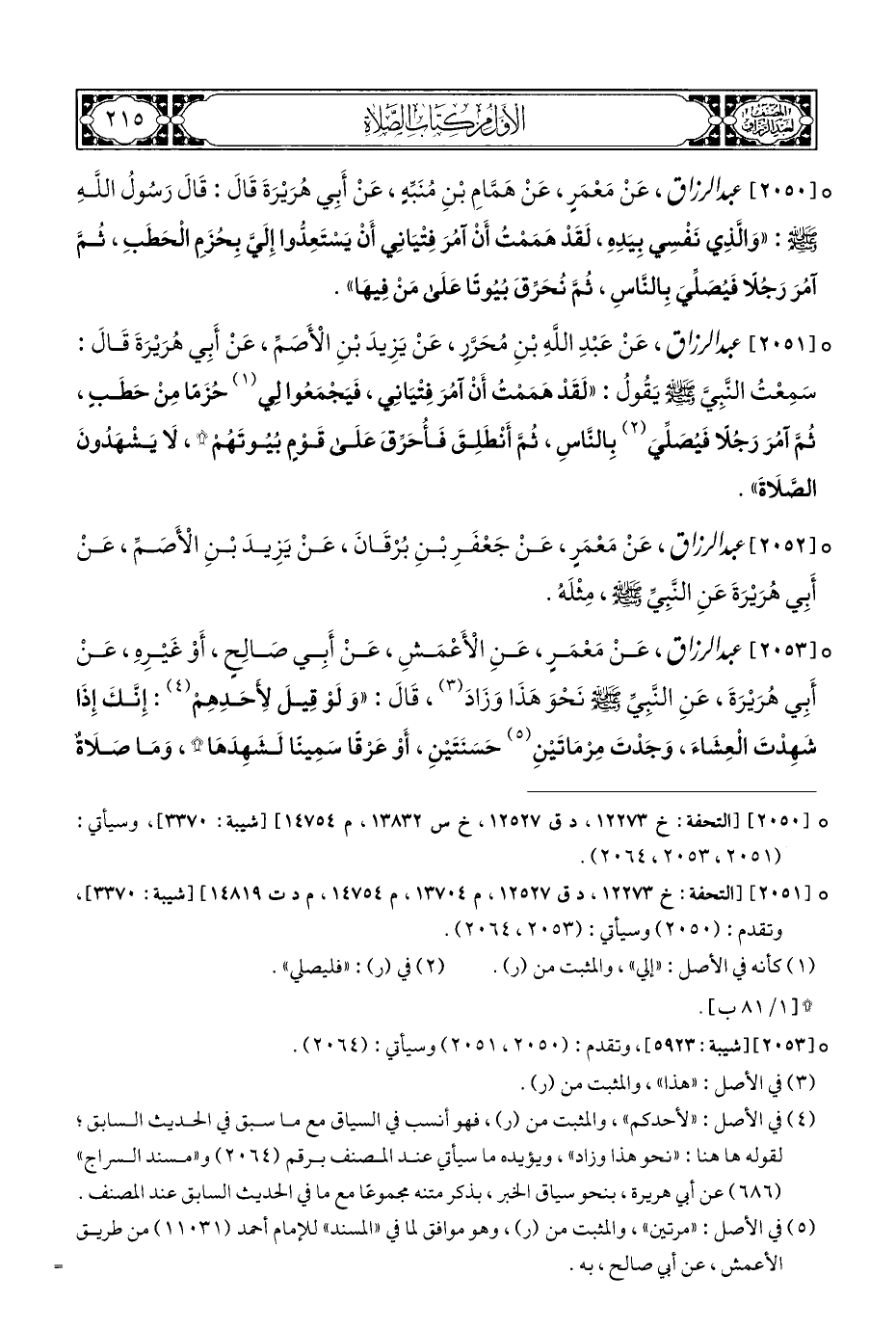 ° [٢٠٥٠] عبد الرزاق، عَنْ مَعْمَرٍ، عَنْ هَمَّامِ بْنِ مُنَبِّهٍ، عَنْ أَبِي هُرَيْرَةَ قَالَ: قَالَ رَسُولُ اللَّهِ - صلى الله عليه وسلم -: "وَالَّذِي نَفْسِي بِيَدِهِ، لَقَدْ هَمَمْتُ أَنْ آمُرَ فِتْيَانِي أَنْ يَسْتَعِدُّوا إِلَيَّ بِحُزَمِ الْحَطَبِ، ثُمَّ آمُرَ رَجُلًا فَيُصَلِّيَ بِالنَّاسِ، ثُمَّ نُحَرِّقَ بُيُوتًا عَلَى مَنْ فِيهَا".