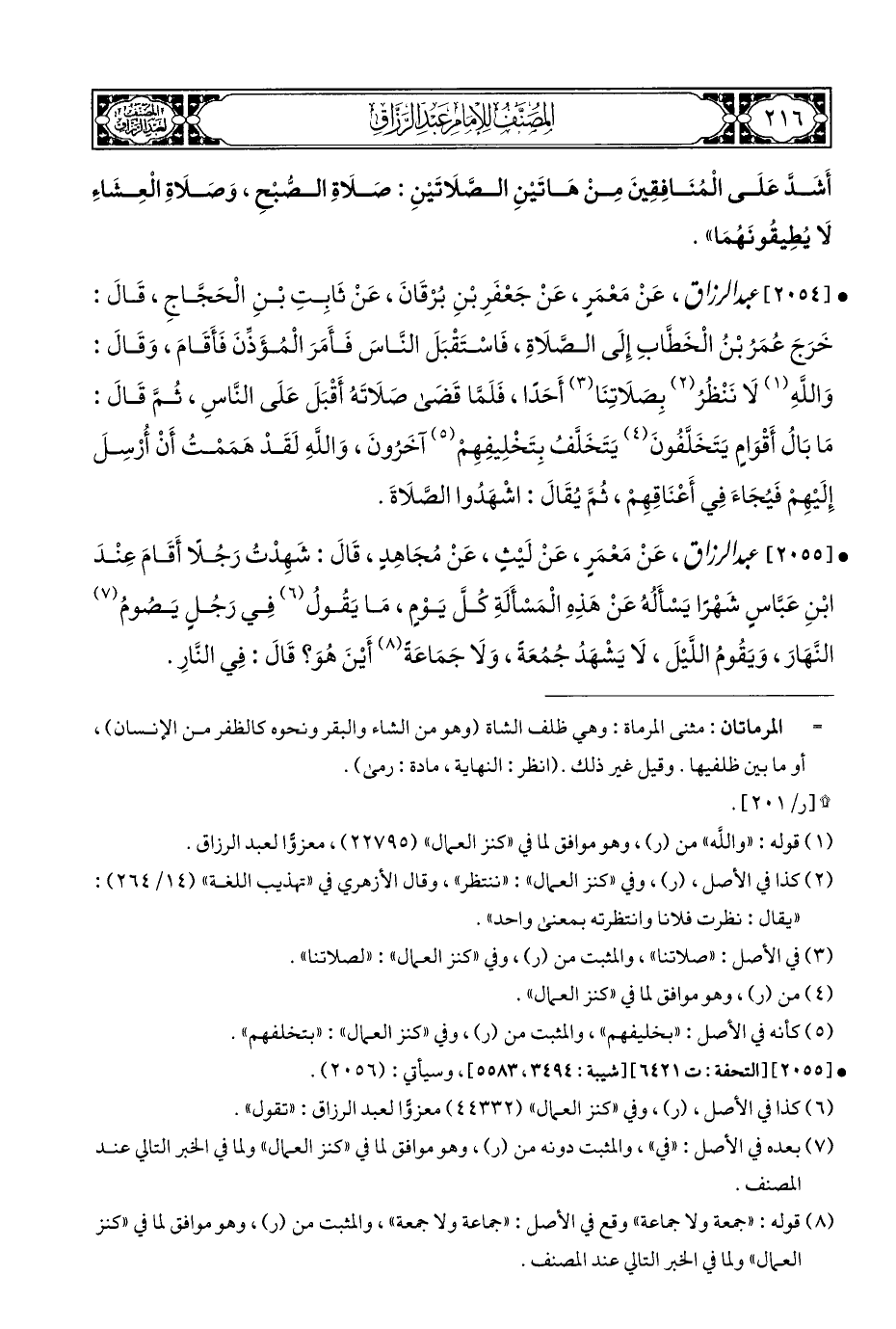 • [٢٠٥٤] عبد الرزاق، عَنْ مَعْمَرٍ، عَنْ جَعْفَرِ بْنِ بُرْقَانَ، عَنْ ثَابِتِ بْنِ الْحَجَّاجِ، قَالَ: خَرَجَ عُمَرُ بْنُ الْخَطَّابِ إِلَى الصَّلَاةِ، فَاسْتَقْبَلَ النَّاسَ فَأَمَرَ الْمُؤَذِّنَ فَأَقَامَ، وَقَالَ: وَاللَّهِ (¬١) لَا نَنْظُرُ (¬٢) بِصَلَاتِنَا (¬٣) أَحَدًا، فَلَمَّا قَضَى صَلَاتَهُ أَقْبَلَ عَلَى النَّاسِ، ثُمَّ قَالَ: مَا بَالُ أَقْوَامٍ يَتَخَلَّفُونَ (¬٤) يَتَخَلَّفُ بِتَخْلِيفِهِمْ (¬٥) آخَرُونَ، وَاللَّهِ لَقَدْ هَمَمْتُ أَنْ أُرْسِلَ إِلَيْهِمْ فَيُجَاءَ فِي أَعْنَاقِهِمْ، ثُمَّ يُقَالَ: اشْهَدُوا الصَّلَاةَ.